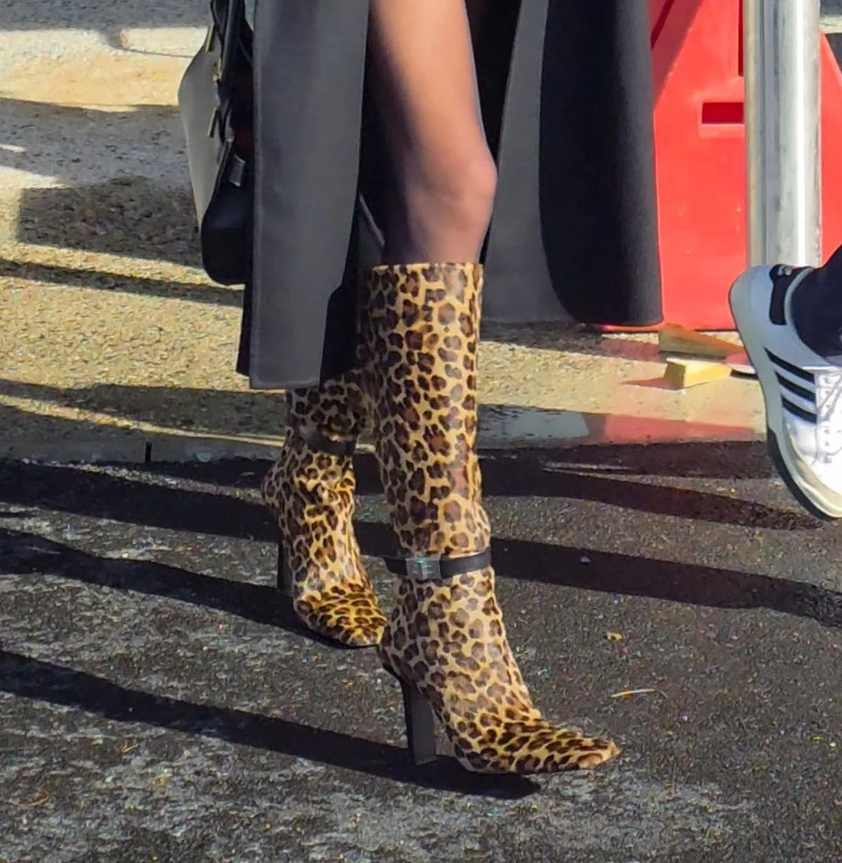 Она дополнила свой образ привлекательными сапогами с леопардовым принтом от этого модного дома.