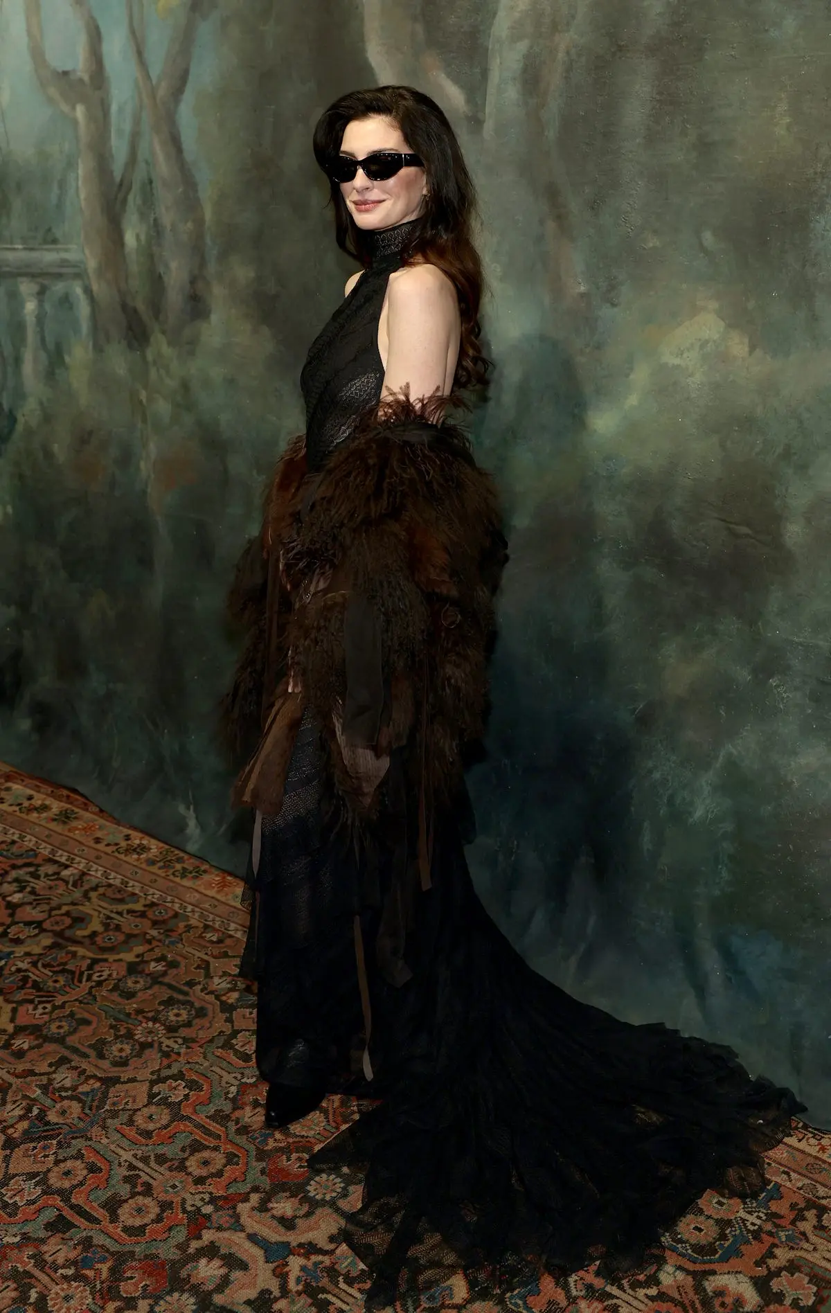 35-летняя актриса выглядела как викторианская королева в специально сшитом для нее бальном платье Chanel из красного бархата, идеально облегающем талию и ниспадающем каскадом в эффектный шлейф, украшенный перьями.