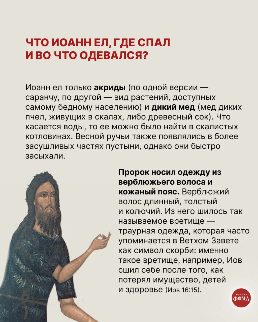 Из Евангелия мы мало что знаем о его жизни до выхода на проповедь — только то, что он много лет находился в пустыне, где вел предельно аскетичный образ жизни. Попробуем выяснить некоторые детали пребывания Иоанна Предтечи вдали от цивилизации.