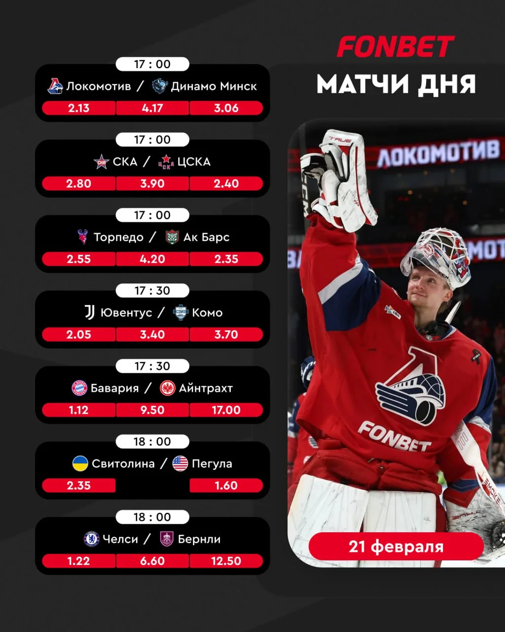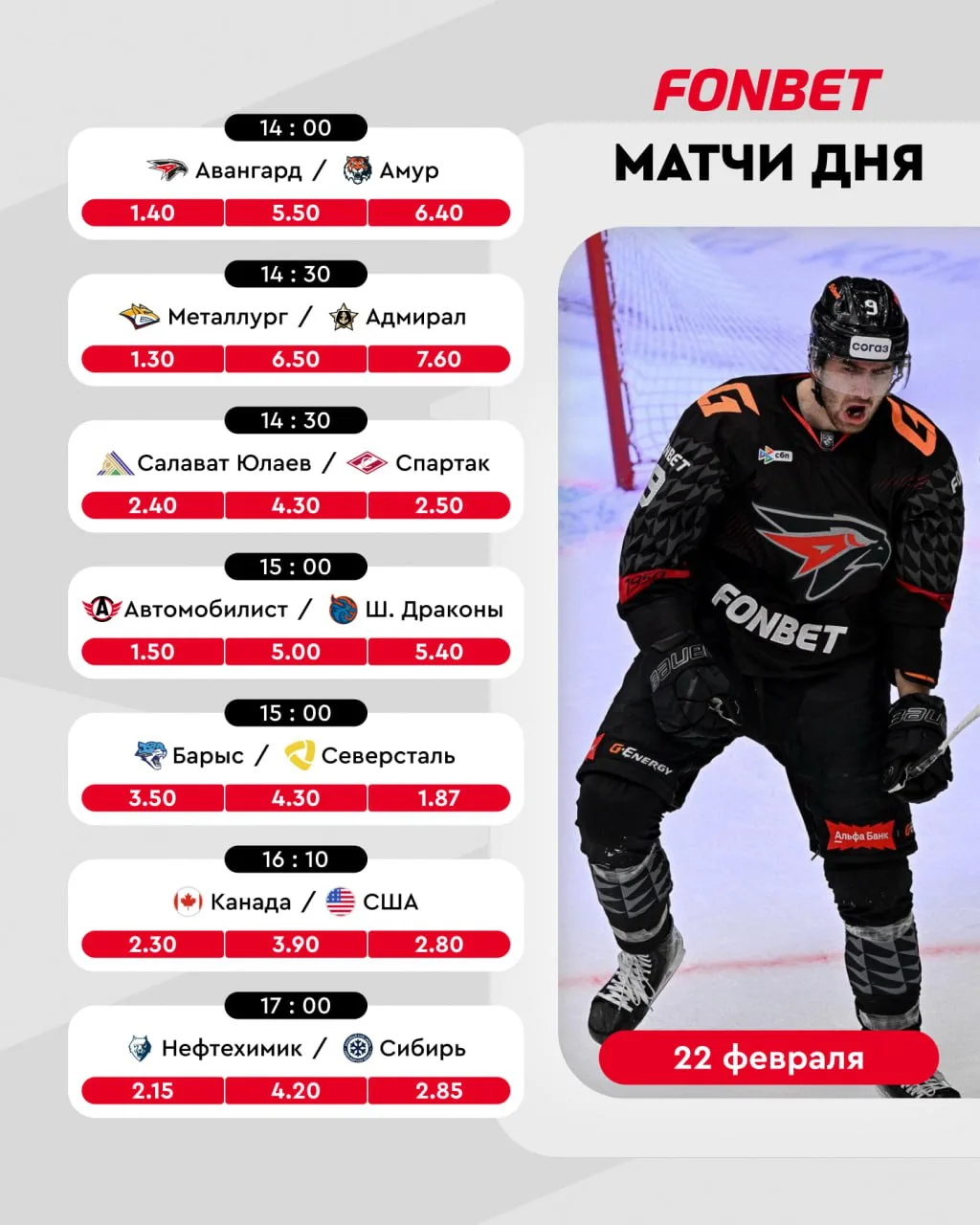 Сегодня тебя ждёт плотный день в FONBET Чемпионате КХЛ, матч за золото Олимпиады, топовые футбольные зарубы и вечерняя игра Егора Дёмина 🏀️