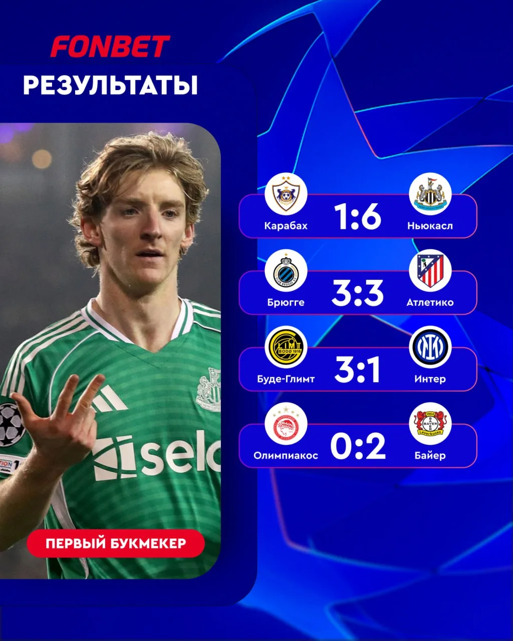 Гордон оформил покер и помог «Ньюкаслу» разгромить «Карабах», «Буде-Глимт» продолжает кошмарить топ-клубы — команда Хайкина дома сенсационно хлопнула «Интер», а также другие результаты.