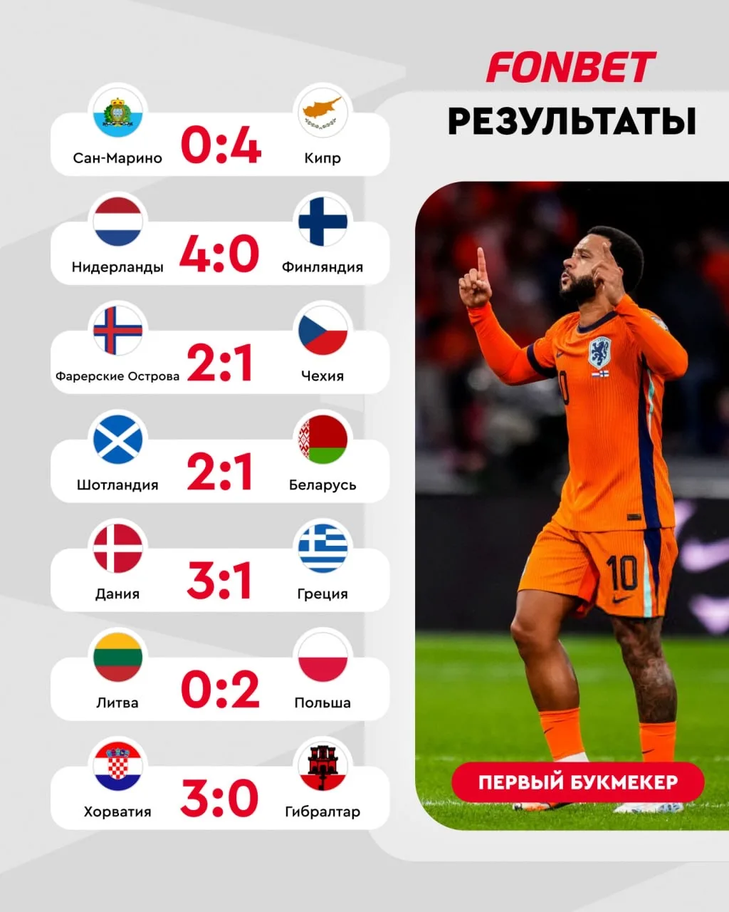 Депай стал лучшим ассистентом в истории Нидерландов, Мактоминей принес Шотландии победу, Шиманьски уложил сухой лист в ворота Литвы и другие результаты 🔥