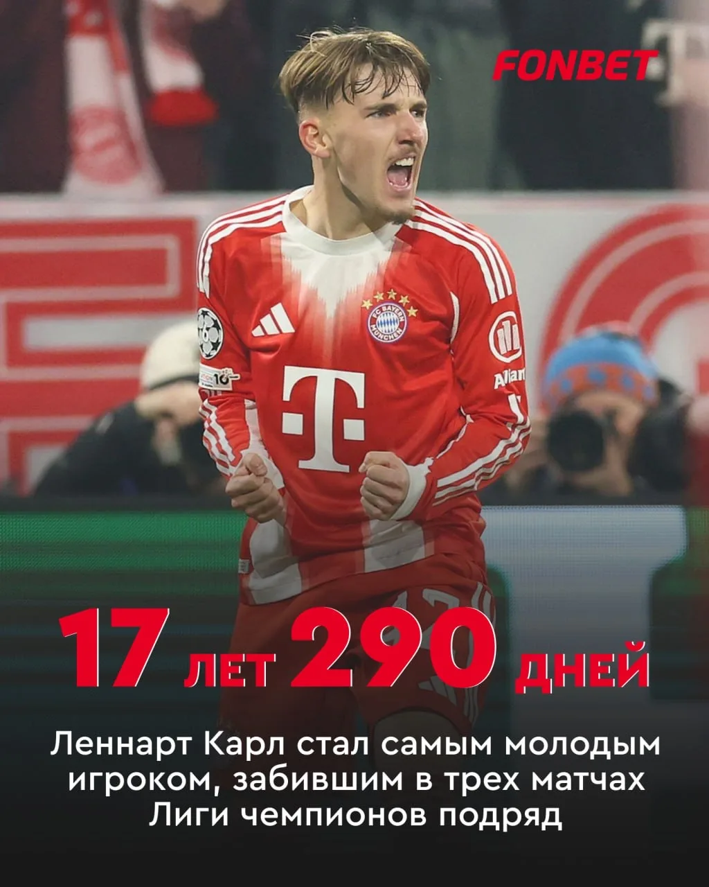 Леннарт Карл творит историю: вундеркинд «Баварии» забил в трех турах ЛЧ подряд и стал самым молодым игроком, кому это удалось 👌