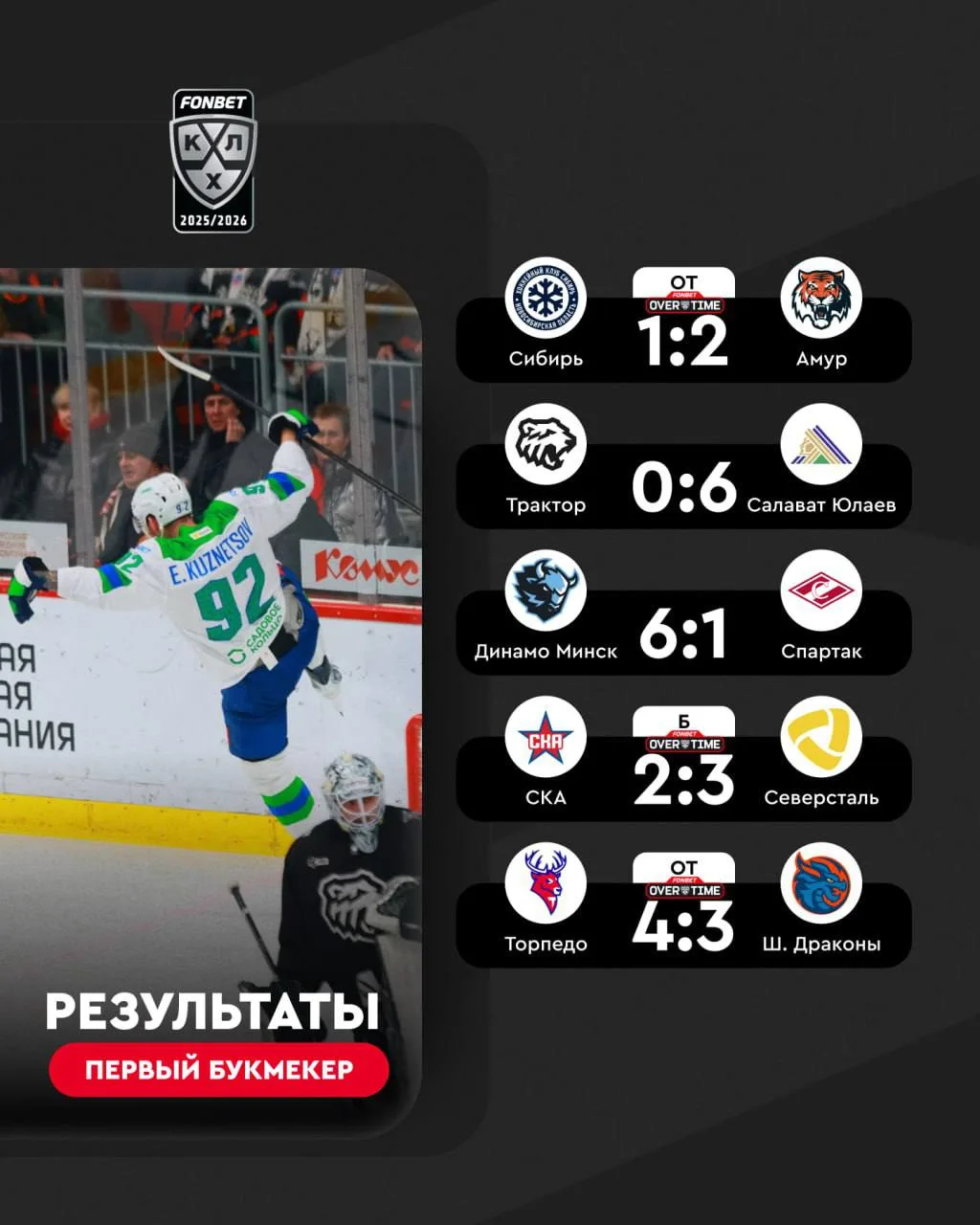 «Салават Юлаев» благодаря четырем очкам Евгения Кузнецова уничтожил «Трактор», «Амур», «Северсталь» и «Торпедо» забрали победы в #FONBETOVERTIME ⏱ и другие результаты.