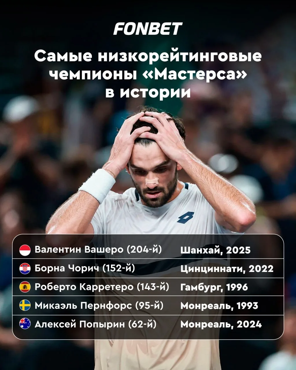 Вашеро шел через квалификацию, брал матч за матчем, выбивая сеяных. Его путь — напоминание всем, что рейтинг не решает, если у тебя есть характер и вера в себя 👍