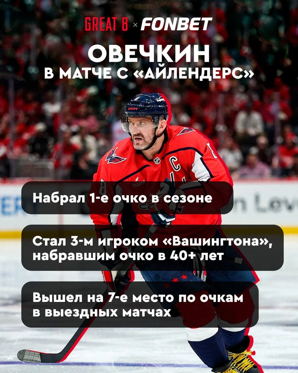 Капитан «Вашингтона» отдал ассист в матче с «Айлендерс» (4:2) и стал всего третьим игроком в истории клуба, кому это удалось в возрасте 40 лет и старше 🔥