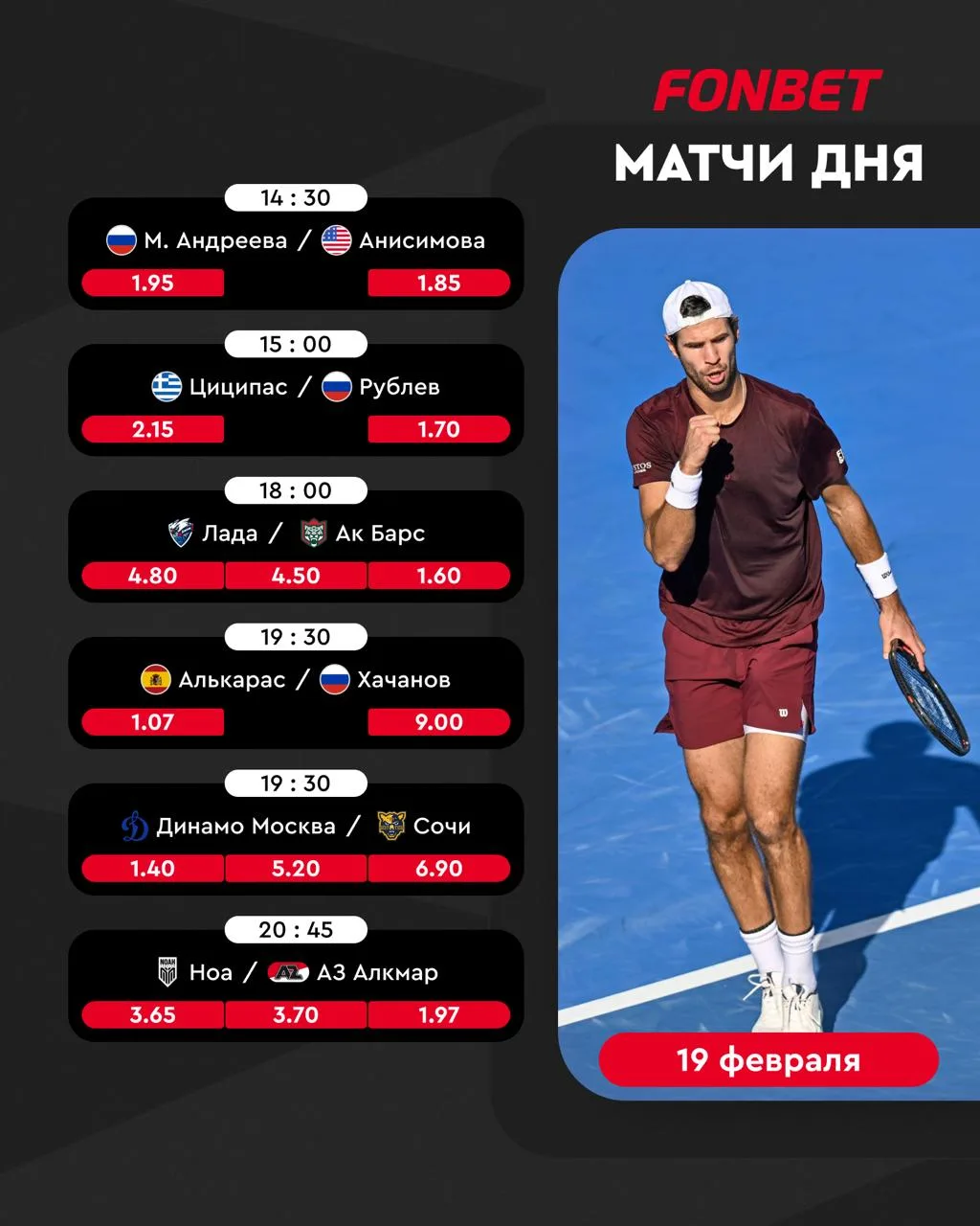 В спортивной программе дня сегодня сразу шесть матчей в FONBET Чемпионате КХЛ, хоккейные полуфиналы на ОИ-26, битва Рублёва и Алькараса, а также европейский футбол на закуску ⚽️