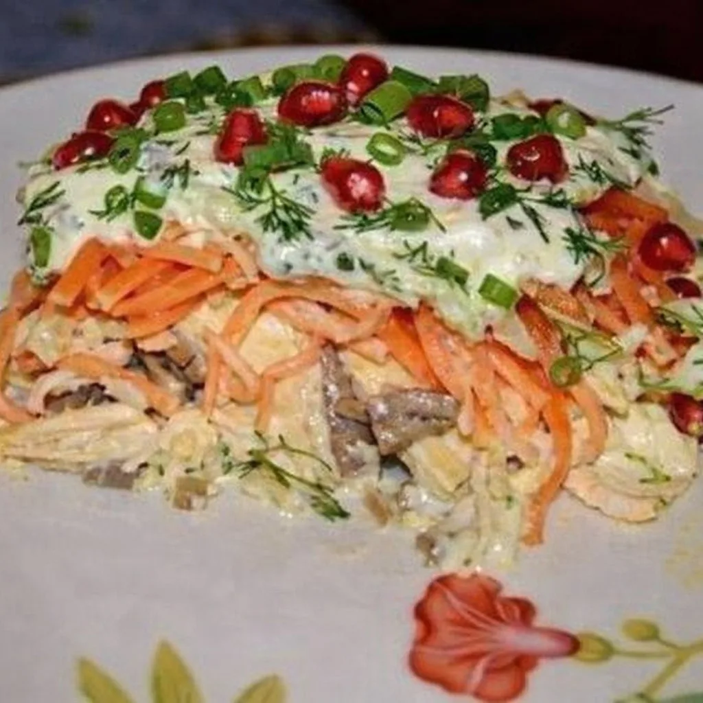 Три года назад мы отмечали Новый Год в Питере, в уютном семейном кафе. Этот салат на праздничном столе был не только самым красивым, но и самым вкусным. И поскольку хозяйка заведения была знакомой одного из наших друзей, мне не составило труда разузнать рецепт. С тех пор я готовлю его не только на Новый Год, но и на другие праздники.
