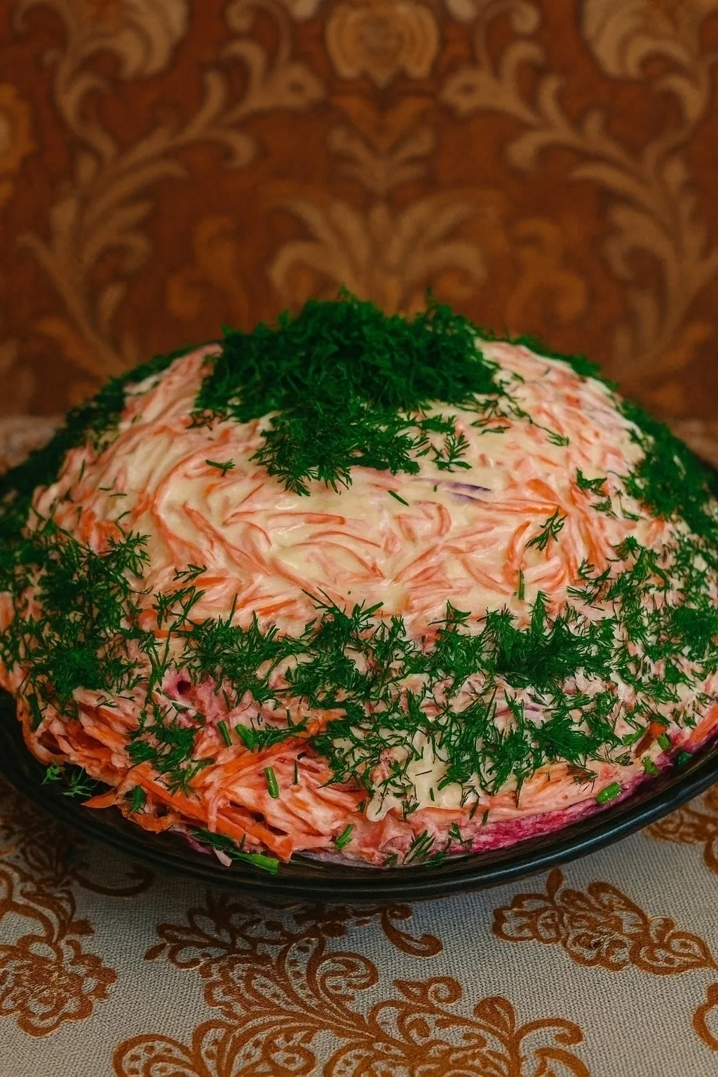 Этот салат — как тёплый, сытный дом: каждый слой — это новый «этаж» из любимых, простых продуктов. Нежная отварная говядинка, родные свёкла и картошечка, пикантная морковка и свежее яблочко. Готовится с душой, а съедается с благодарностью!