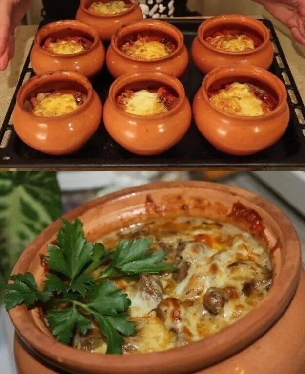 Настало время наполнять горшочки. На дно каждого горшочка кладем по пол чайной ложки сливочного масла, перетертого с чесноком, посыпаем зеленью (отлично подойдет базилик) или прованскими травками. Далее кладем картофель, поливаем мясным бульоном и полусухим вином (1-2 ст. ложки). Затем выкладываем обжаренные с грибами овощи, после которых следует мясо. Посыпаем специями и небольшим количеством соли. Заливаем содержимое горшочков сырно-яичной массой так, чтобы она полностью покрыла мясо. Отправляем горшочки в разогретую духовку и запекаем мясо по-французски при температуре 180 градусов в течение 30-40 минут.