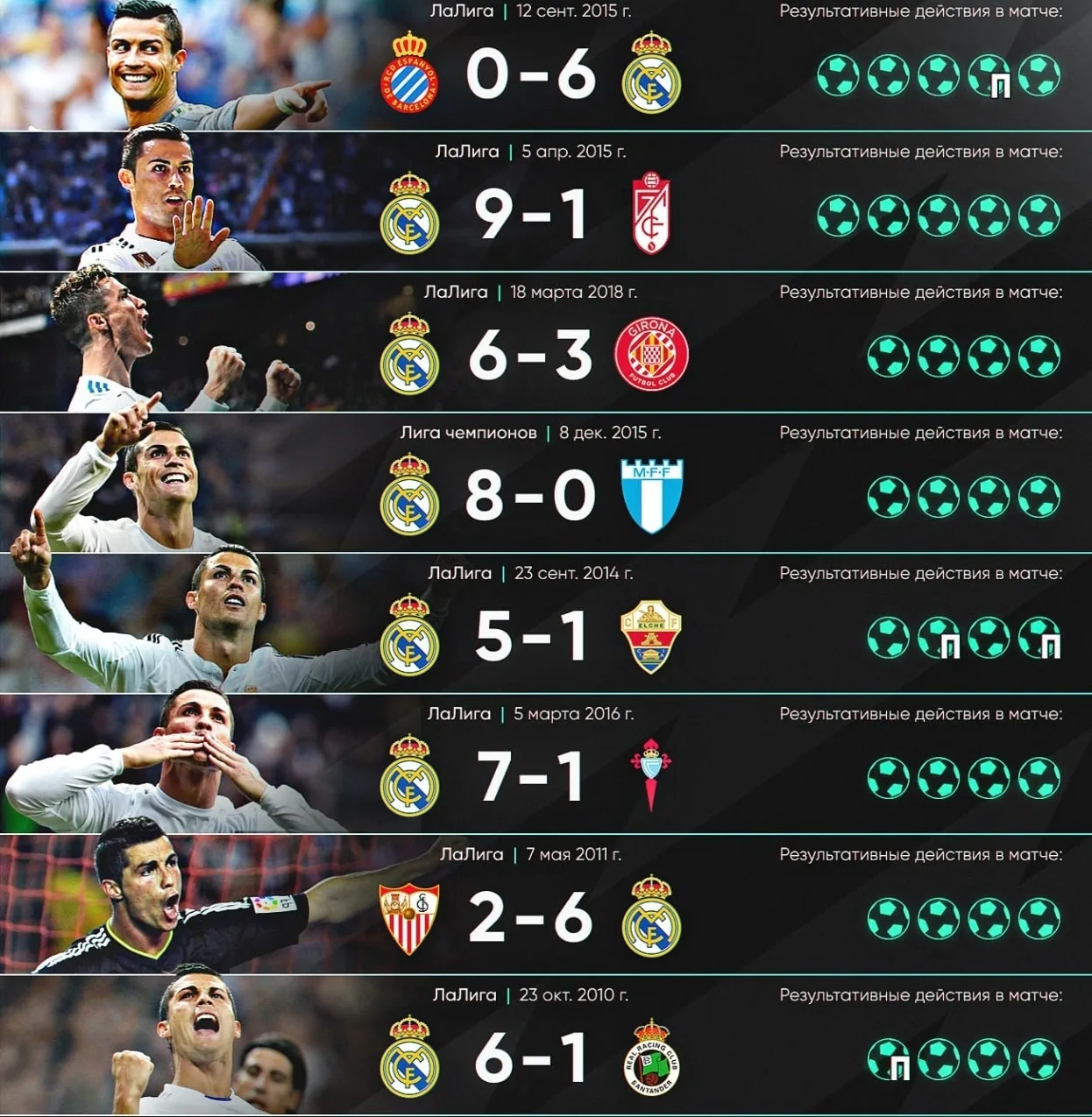 • 2015 год: «Мадрид» не выиграл ни одного трофея. Анчелотти ушел из «Реала». Роналду выиграл «Золотую бутсу».