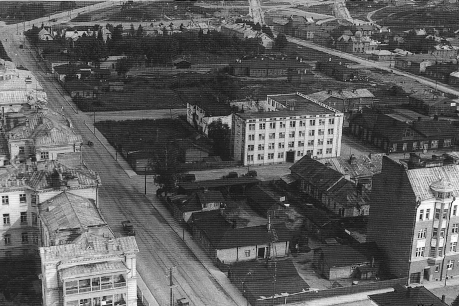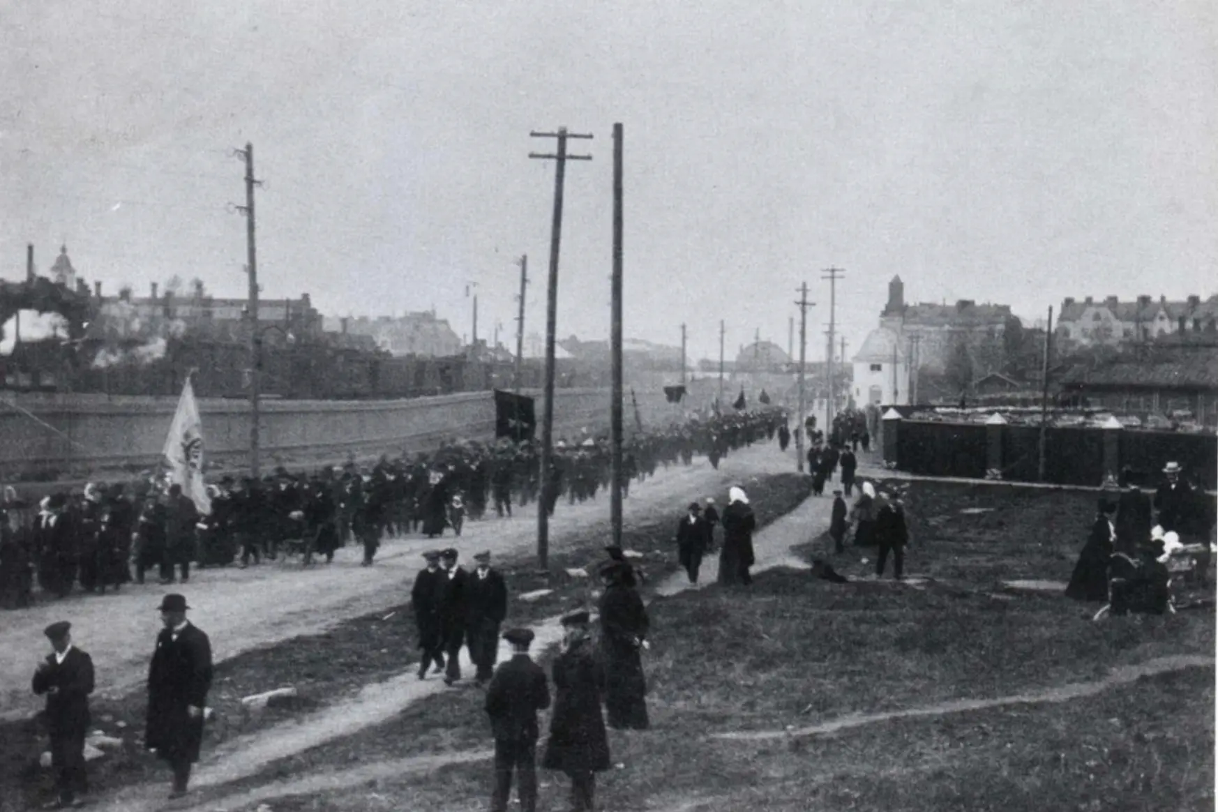 Первомайская демонстрация по Кузнечной улице,на заднем плане фото жд вокзал и дома по улице Кривоносова,названия улиц современные,справа на фото выборгская тюрьма,слева жд дорога.