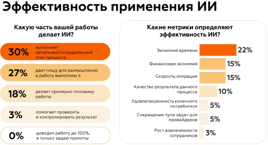 🔶Из 2000 опрошенных активно используют ИИ в ежедневной работе – 20%, обращаются к нему точечно – 56%, не доверяют технологии или не имеют ресурсов для внедрения – 10%.