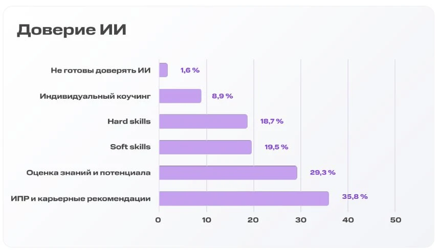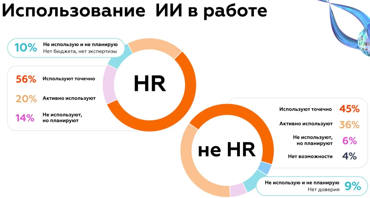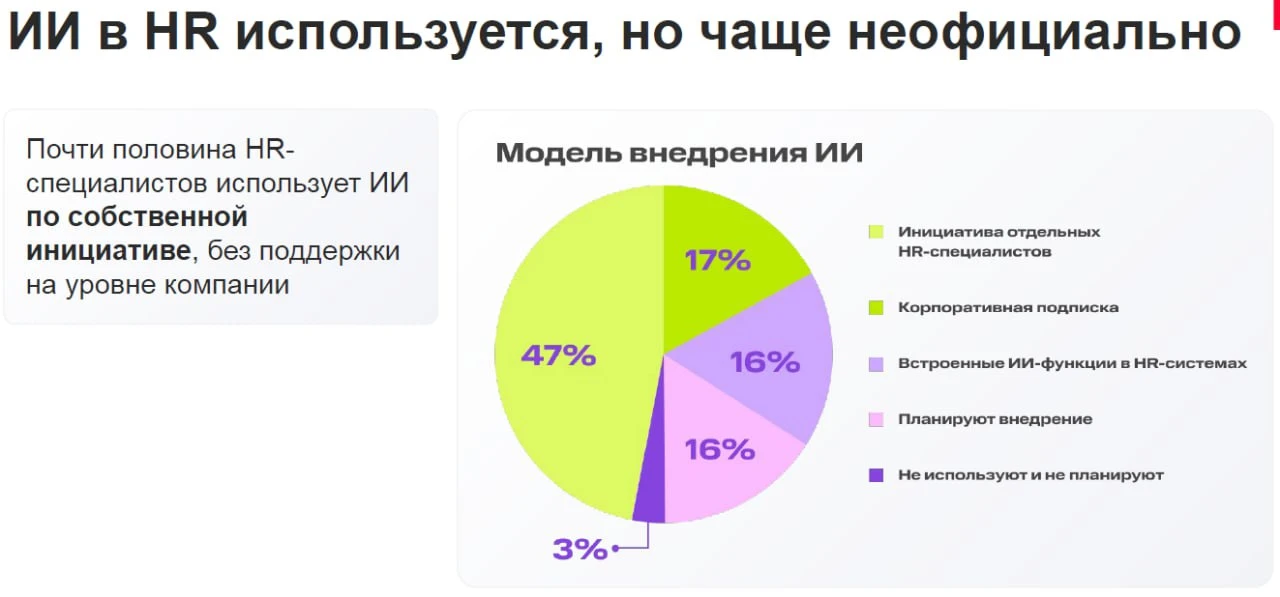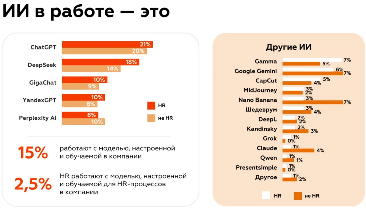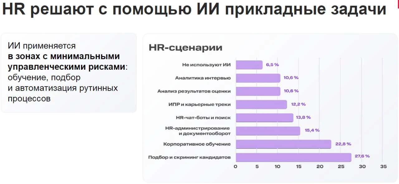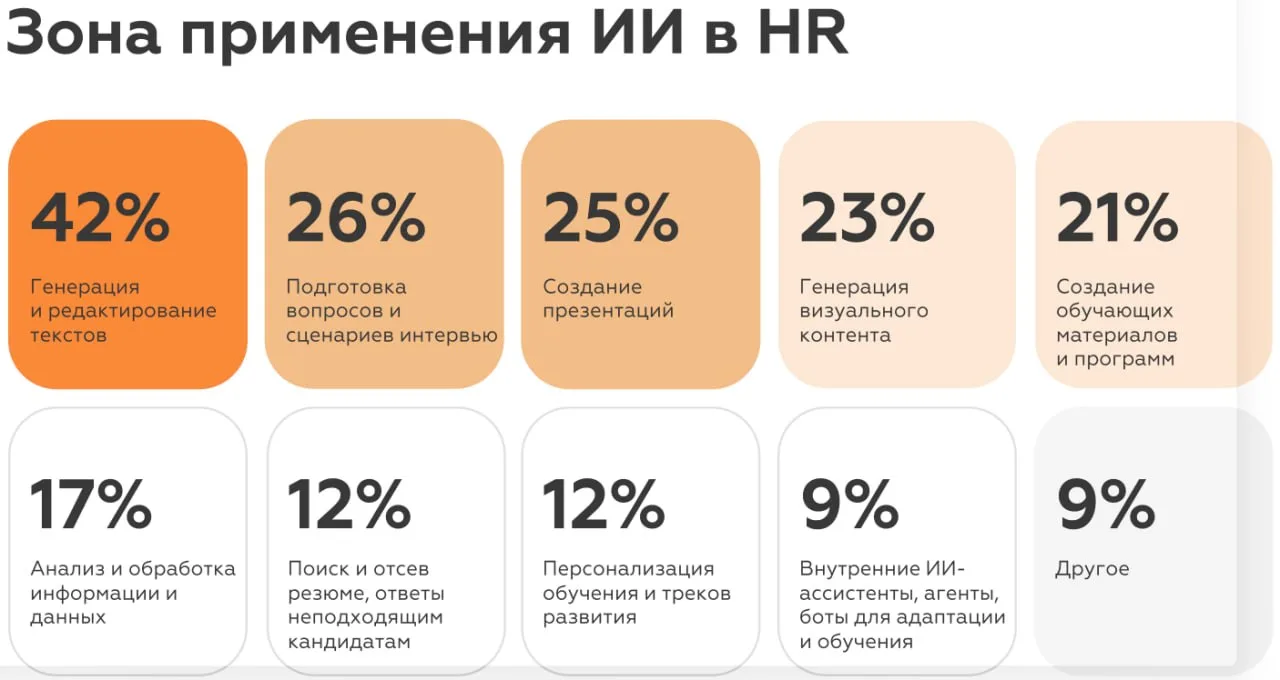 🔶Вне HR-функционала ИИ чаще всего применяют для креативных задач, дизайна, работы с текстами, данными и подготовки презентаций, а в рамках HR-рутины — для генерации текстов, визуального контента, создания обучающих материалов и сценариев интервью.