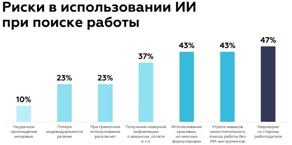 🔶В целом такое использование технологий для поиска работы считается этичным, если подобный инструмент используется в помощь для решения отдельных задач. Однако, ключевым риском пока остается недоверие работодателей, потеря индивидуальности и искажение информации при обработке ИИ. Причем в последнем случаем речь идет как о резюме, так и о вакансиях.