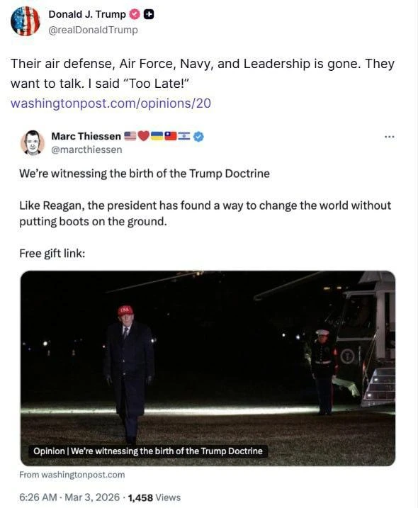 "Их ПВО, ВВС, ВМФ и руководство уничтожены. Они хотят поговорить. Я сказал: «Слишком поздно!» - заявил президент США.