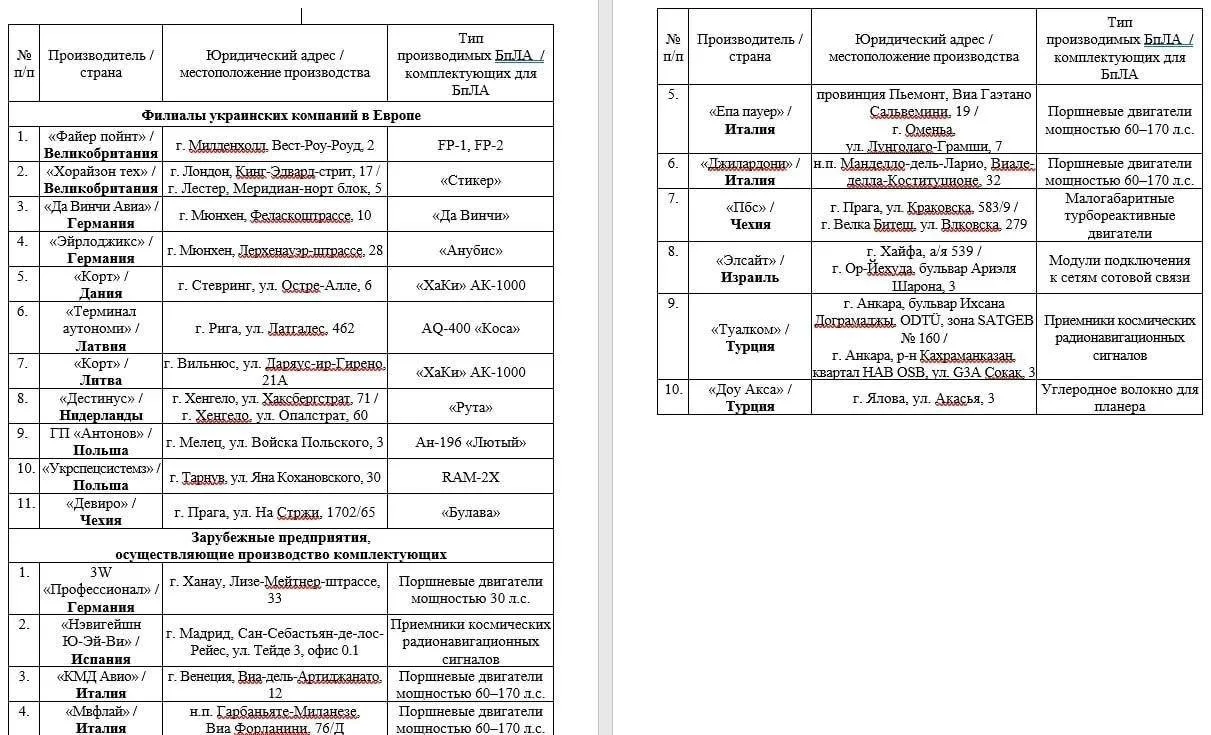 Также МО опубликовало список стран и адресов где производят БПЛА для Украины.