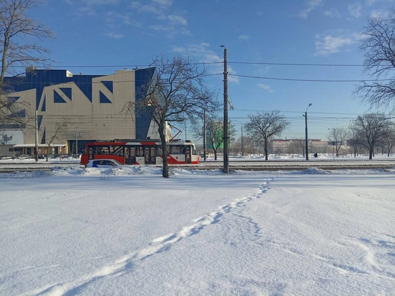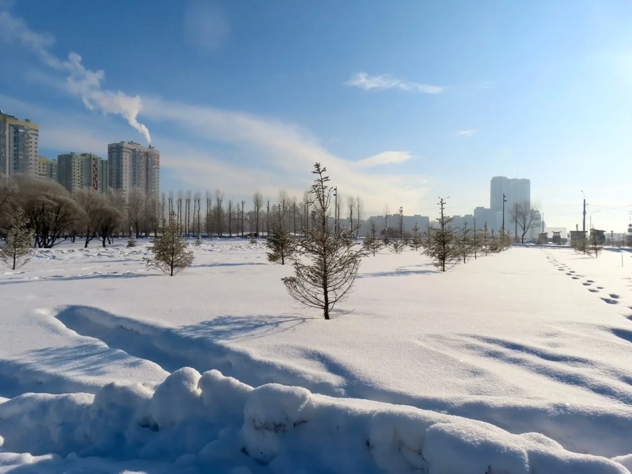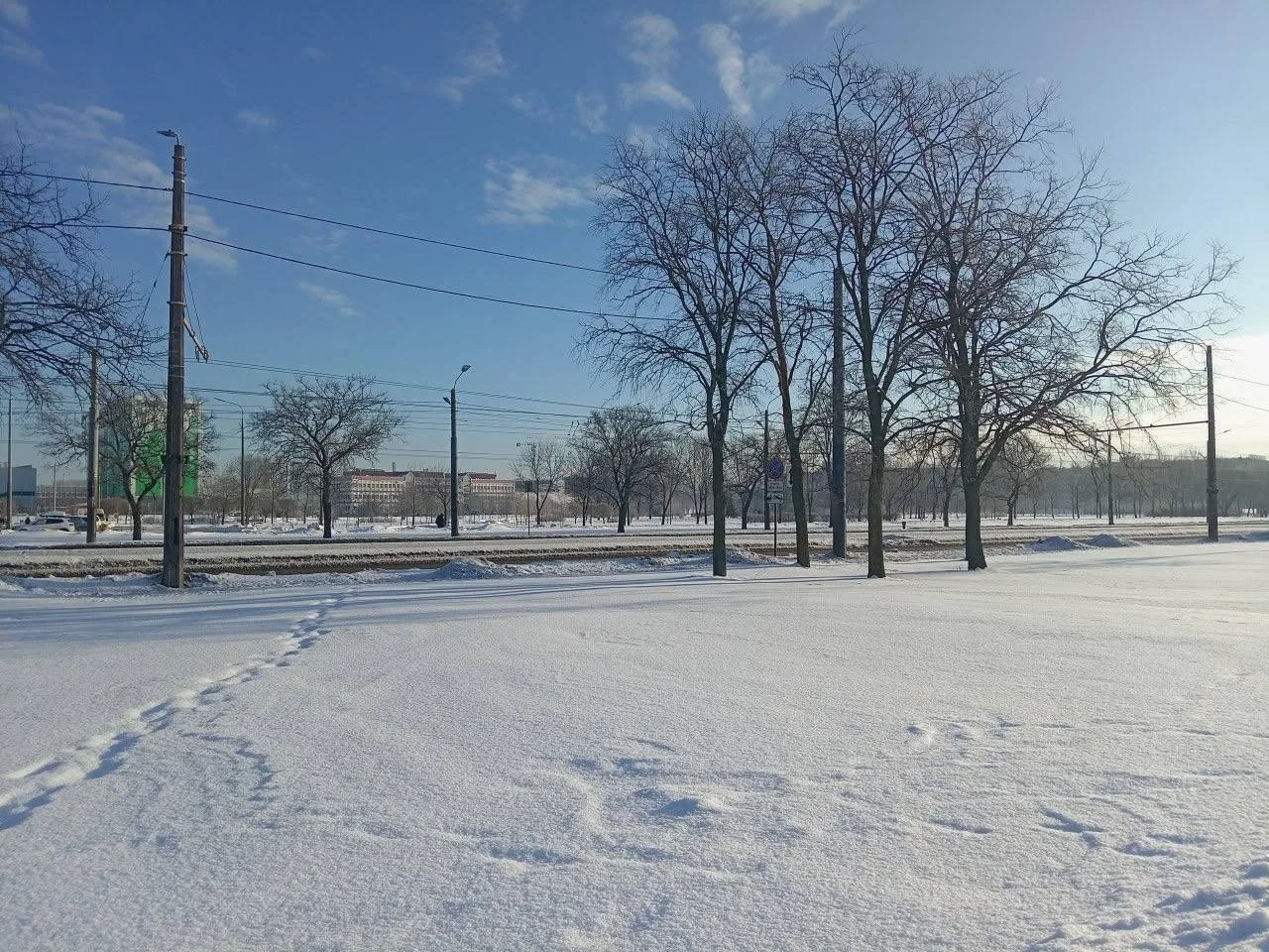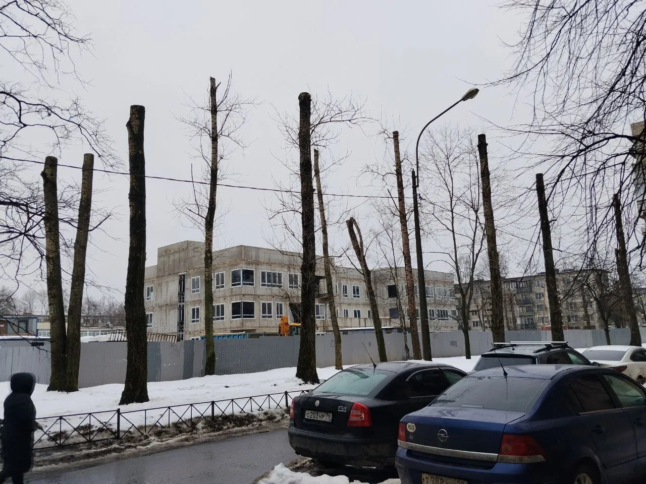Уютный зелёный сквер у дома 12 на проспекте Славы превратился в обрезанные тополя — новых ветвей придётся ждать годы, а пока они не смогут сдерживать пыль от затянувшейся стройки. Детская площадка исчезла ради возведения большого детского сада.