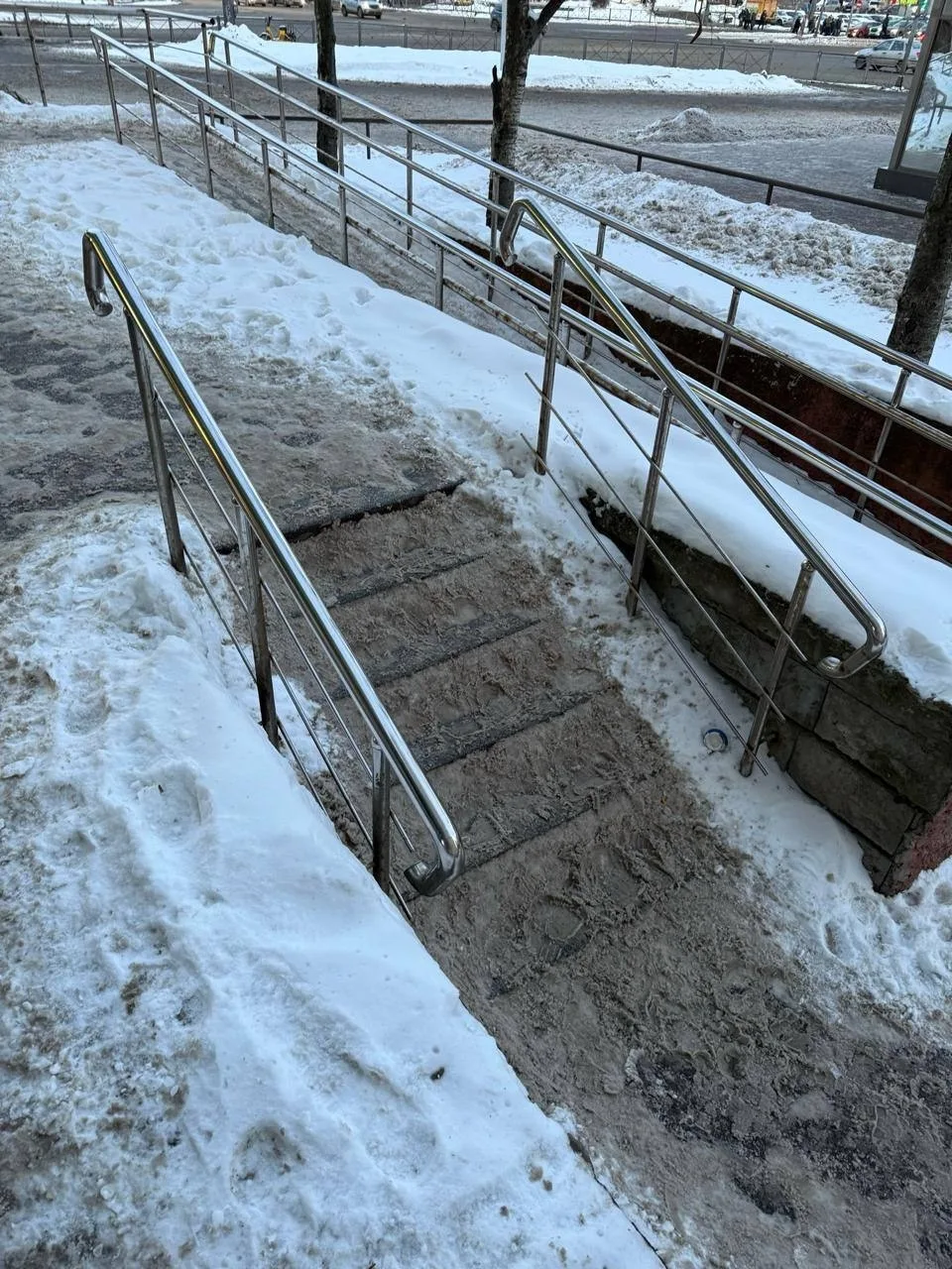 За всю зиму участок по адресу Бухарестская, 23, а также на территорию под аркой, ни разу не убирали: лестница покрыта снегом, под которым прячется лёд и снежная каша.