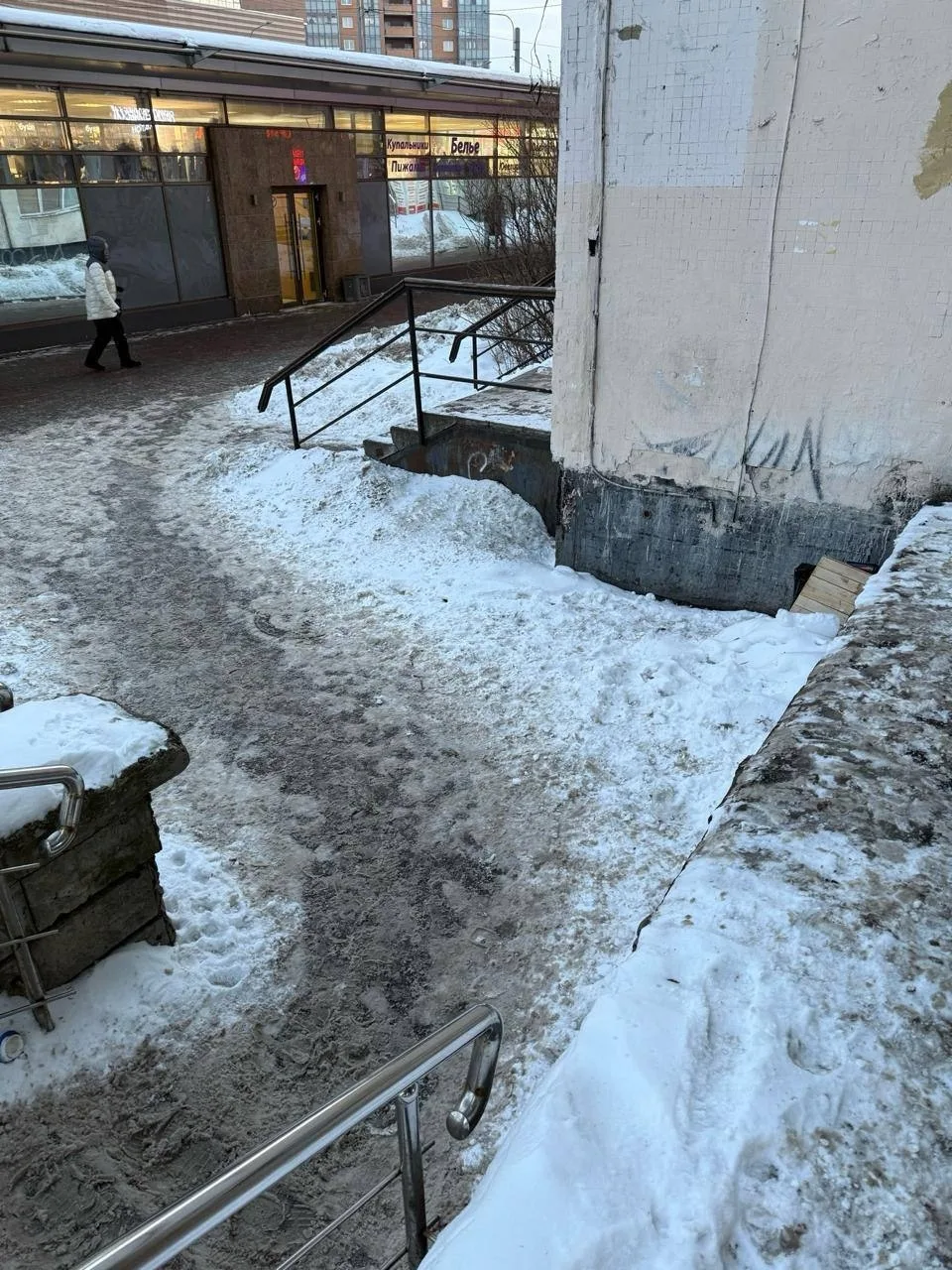 Жители Купчино жалуются на состояние лестницы к магазину Пятёрочка.