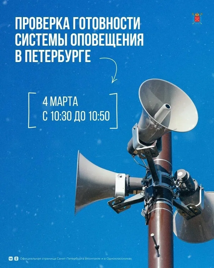Уважаемые жители! 4 марта с 10:30 до 10:50 в Петербурге состоится плановая проверка региональной системы оповещения населения.