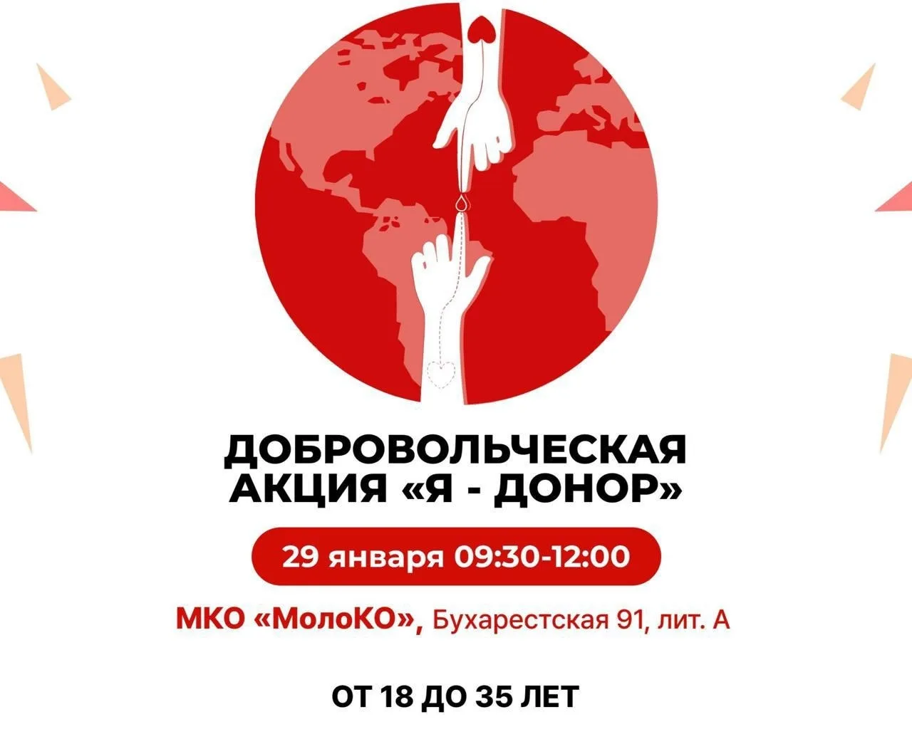 29 января в Молодёжном центре «Молоко» (ул. Бухарестская, 91, лит. А) пройдёт акция «Я — донор» для молодежи Фрунзенского района.