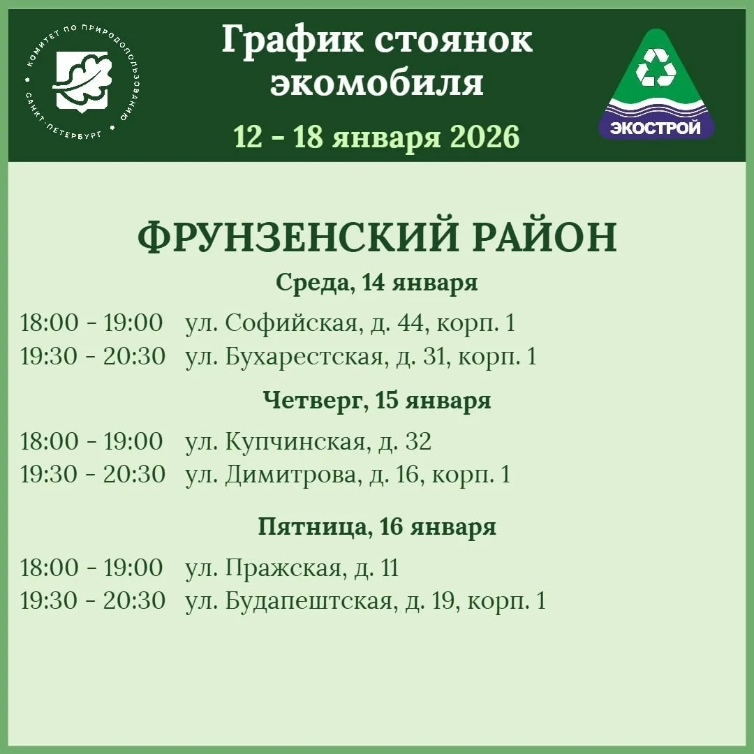 17 и 18 января 2026 года во Фрунзенском районе Санкт-Петербурга начнёт работать система сбора новогодних ёлок в экоцентрах и городских экопунктах. Жители смогут выбрать удобное место и сдать живые деревья на переработку.