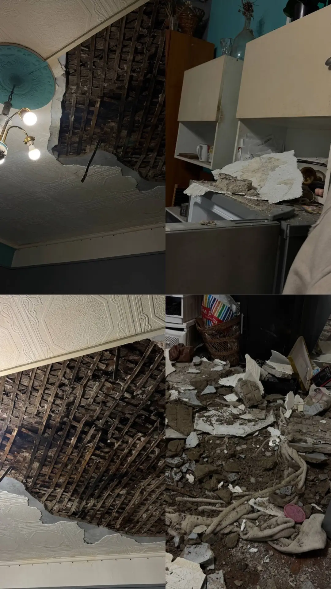 В доме в 5-минутах езды от центра города обрушился потолок в жилом помещении, что в комнате никого не было - большое счастье, случилось в рабочее время. Мчс / жилищно-коммунальная служба и полиция не берутся - отправляют друг к другу!!!!
