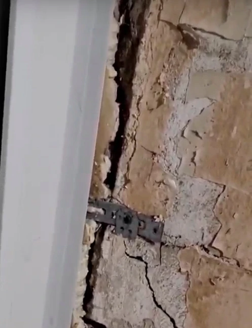 «Вверху расходится там намного больше, кирпичи порвало, тянут наружу. Верхний дюбель вырвало полностью, средний еще держится, нижний на месте. В общем, тянет все раму на улицу»,- рассказал хозяин квартиры.