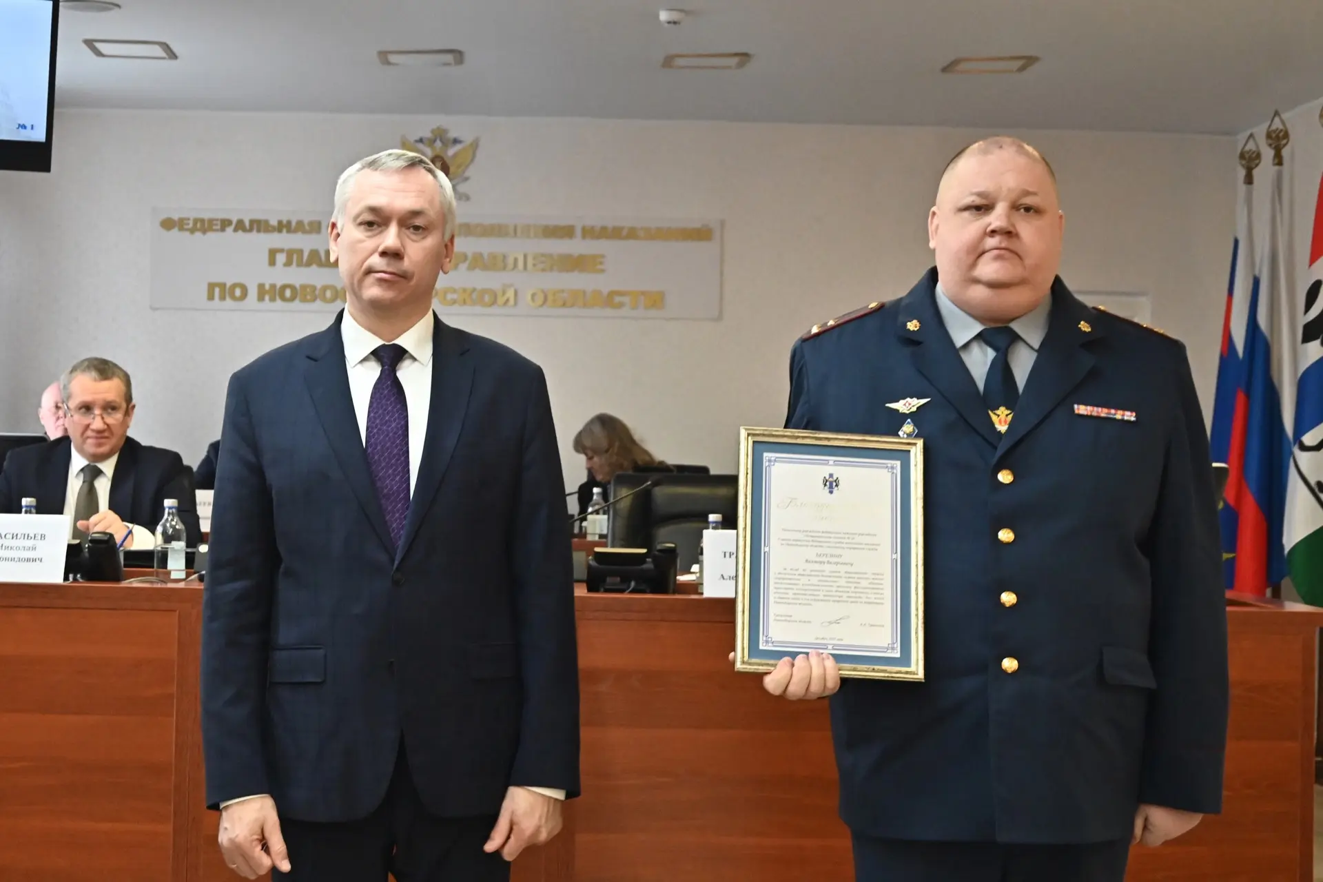 На коллегии с приветственным словом выступил Губернатор региона Андрей Травников. Он от себя лично и от имени Правительства области поблагодарил сотрудников ГУФСИН за качественное выполнение служебных обязанностей и активное участие в общественной жизни.