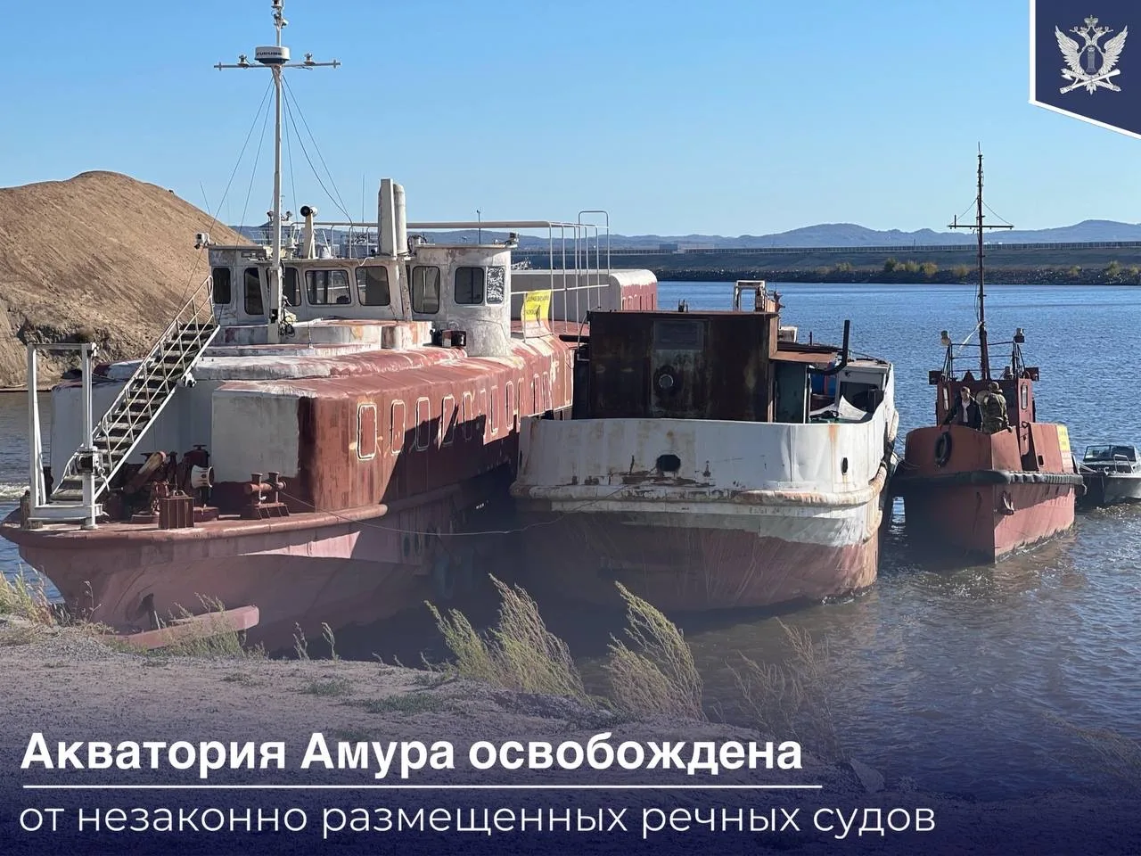 ⛴Жительница Хабаровска самовольно разместила речныe судна «Вятка», «Минтай» и «ОМ-7» в Амурской протоке рядом с одним из торговых центров города.