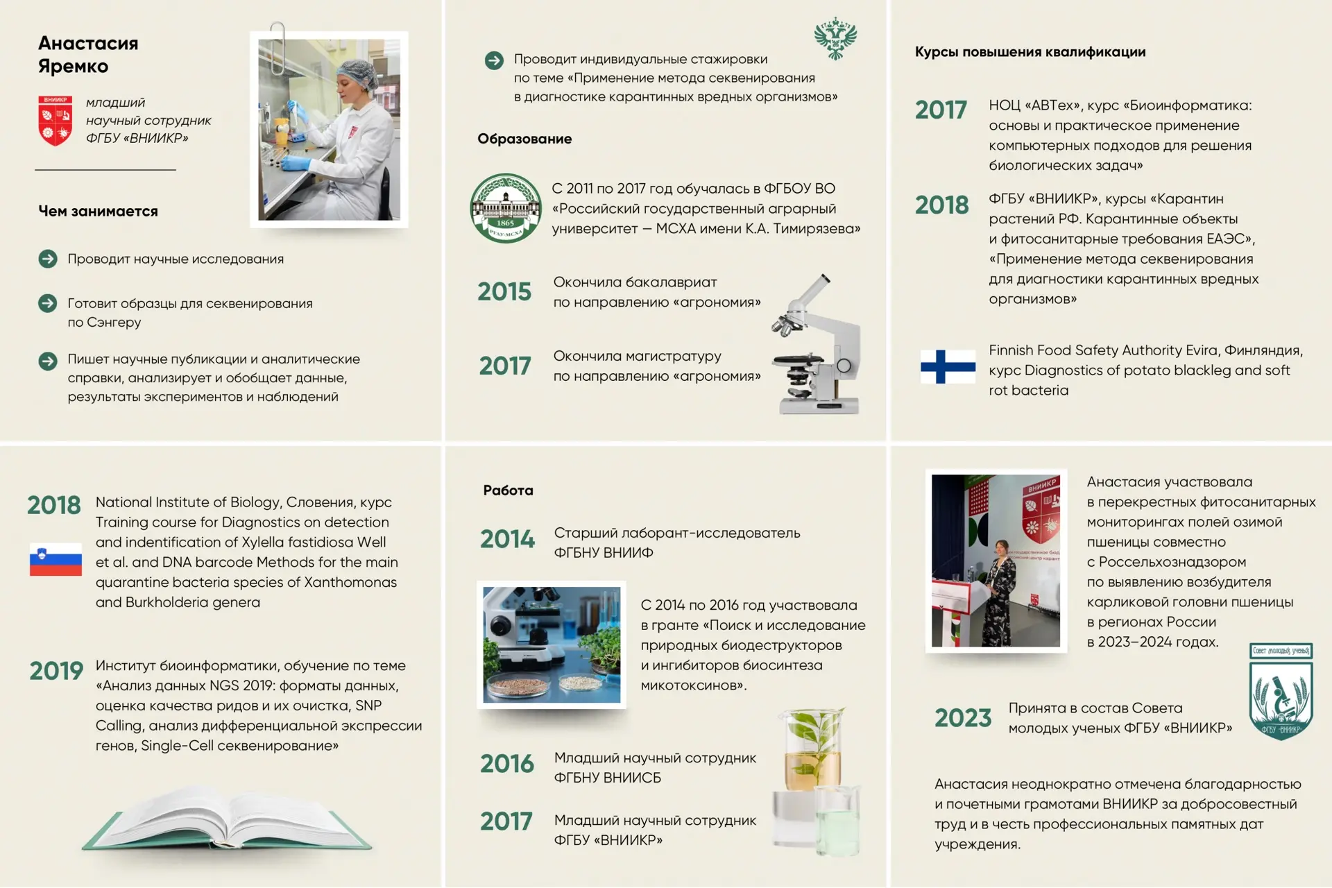 Анастасия работает над исследованием карантинных вредных организмов, проводит индивидуальные стажировки и участвует в перекрестных фитосанитарных мониторингах.