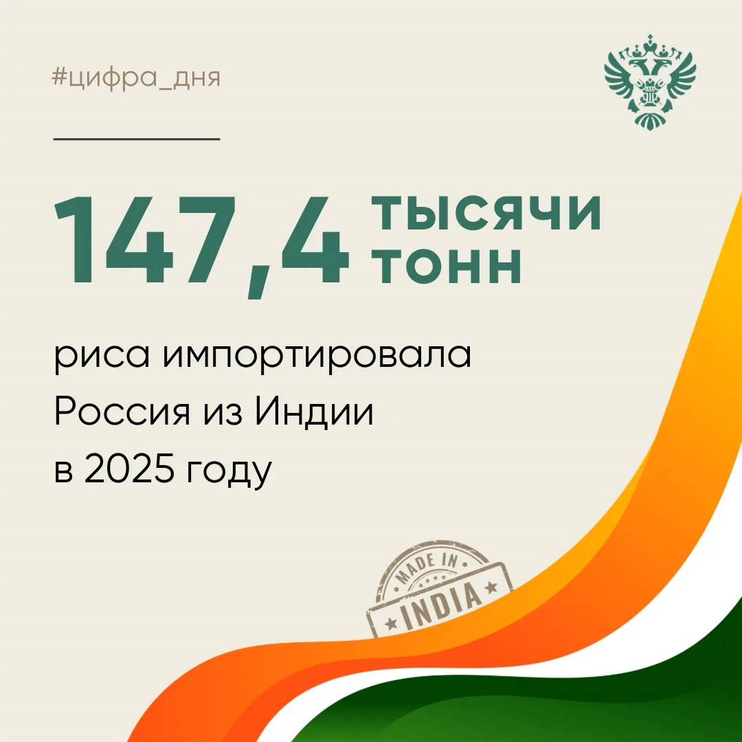 В 2025 году Россия импортировала 147,4 тысячи тонн риса из Индии.