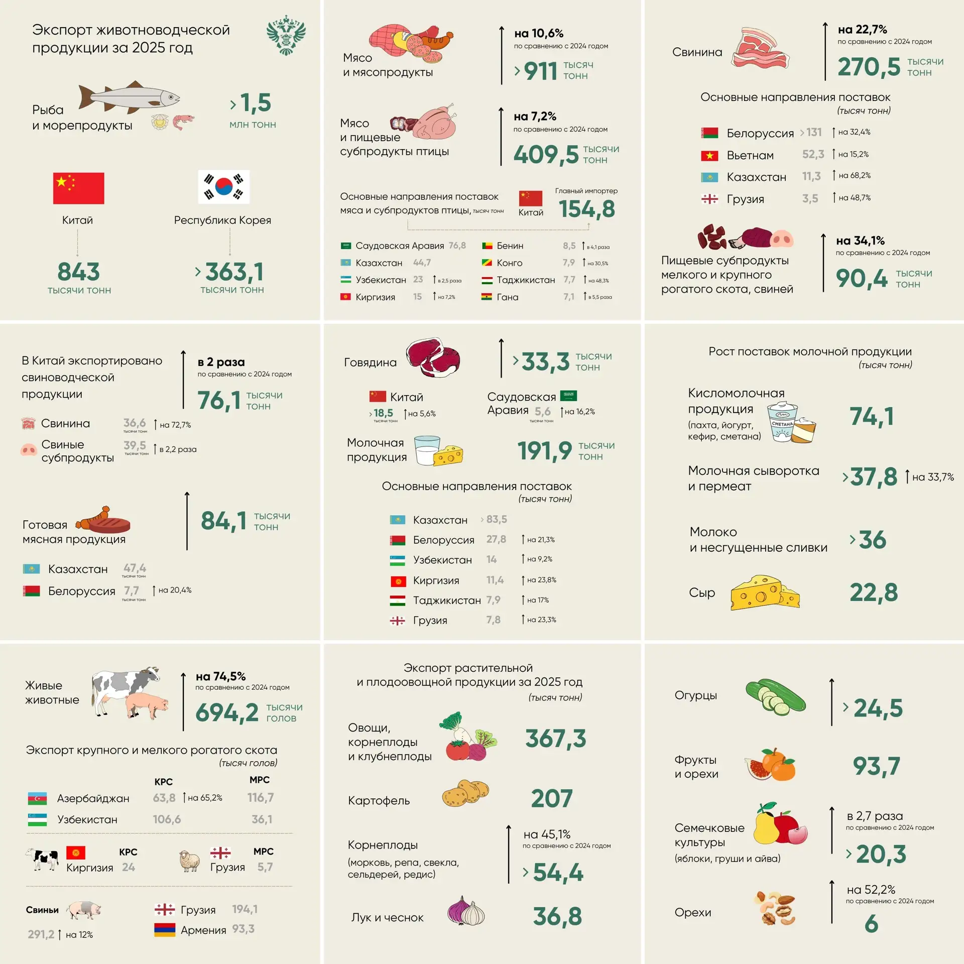 📈По данным информационных систем Россельхознадзора «ВетИС» и «Аргус-Фито», по итогам 2025 года по сравнению с прошлым годом российские производители увеличили объем поставок за границу животноводческой, растительной и плодоовощной продукции.