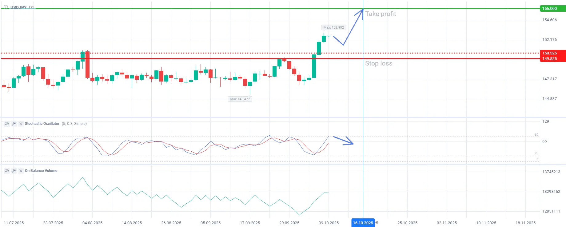 ➡️ С технической стороны на рынке наблюдается активный рост курса USDJPY, подтверждаемый устойчивым подъемом On Balance Volume, указывающим на усиление покупательского давления и поддержку текущего восходящего движения. Однако резкий рост цен привел к достижению зоны перекупленности по стохастическому осциллятору (%K=81, %D=58), что повышает вероятность начала коррекции в ближайшее время.