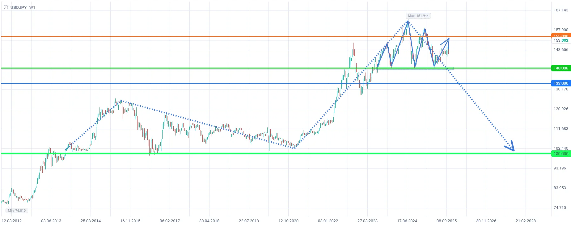 ➡️ Если посмотреть на валютную пару USDJPY на недельном интервале, то можно заметить формирование очень растянутой во времени разворотной фигуры «голова-плечи». Левое плечо начало формироваться еще в 2013 году, а закончило в 2020 году. В течение последних пяти лет идет отрисовка «головы», которая продлится еще, вероятно, 2-3 года. Эта крупная многолетняя фигура показана синей пунктирной линией. Причем, сама «голова», в свою очередь также состоит из аналогичной фигуры (показана синей сплошной линией). Если в ближайшие недели котировки USDJPY пробивают уровни 140,00 и 133,00, то им открывается дорога вниз к к круглому уровню 100,00, на котором завершится формирование «головы» и начнется долгий путь рисования правого плеча. Сейчас котировки USDJPY делают финальную кульминацию перед предстоящим резким движением вниз к отметке 140,00. Эта кульминация заключается в ликвидации налипших продавцов через серию шорт-сквизов. После того, как основная масса позиций в продажу будет закрыта, пара развернется и пойдет вниз. Нужно наблюдать за уровнем 140,00. Уверенное его пробитие обозначит последующую цель на отметке 133,00.