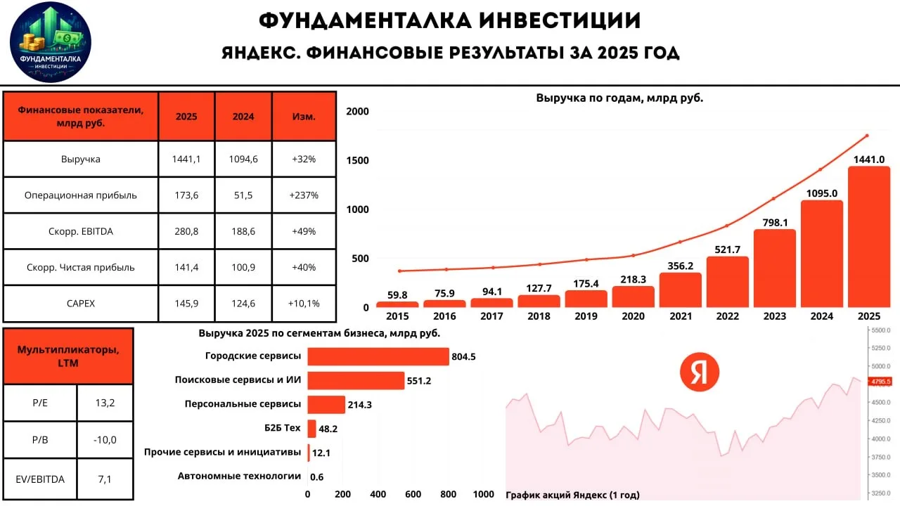 📈 За 2025 год выручка группы Яндекс выросла на 32% г/г и достигла 1441,1 млрд руб. благодаря опережающим темпам роста по ключевым сегментам бизнеса. Стоит отметить весомый вклад сегмента финансовые сервисы, темпы которого составили +156% относительно прошлого года. Рост выручки, а также повышение маржинальности отдельных бизнес направлений привели к росту скорректированной EBITDA на 49% г/г - до 804,5 млрд руб. В свою очередь, скор. чистая прибыль увеличилась на 61% г/г и составила 214,3 млрд руб.