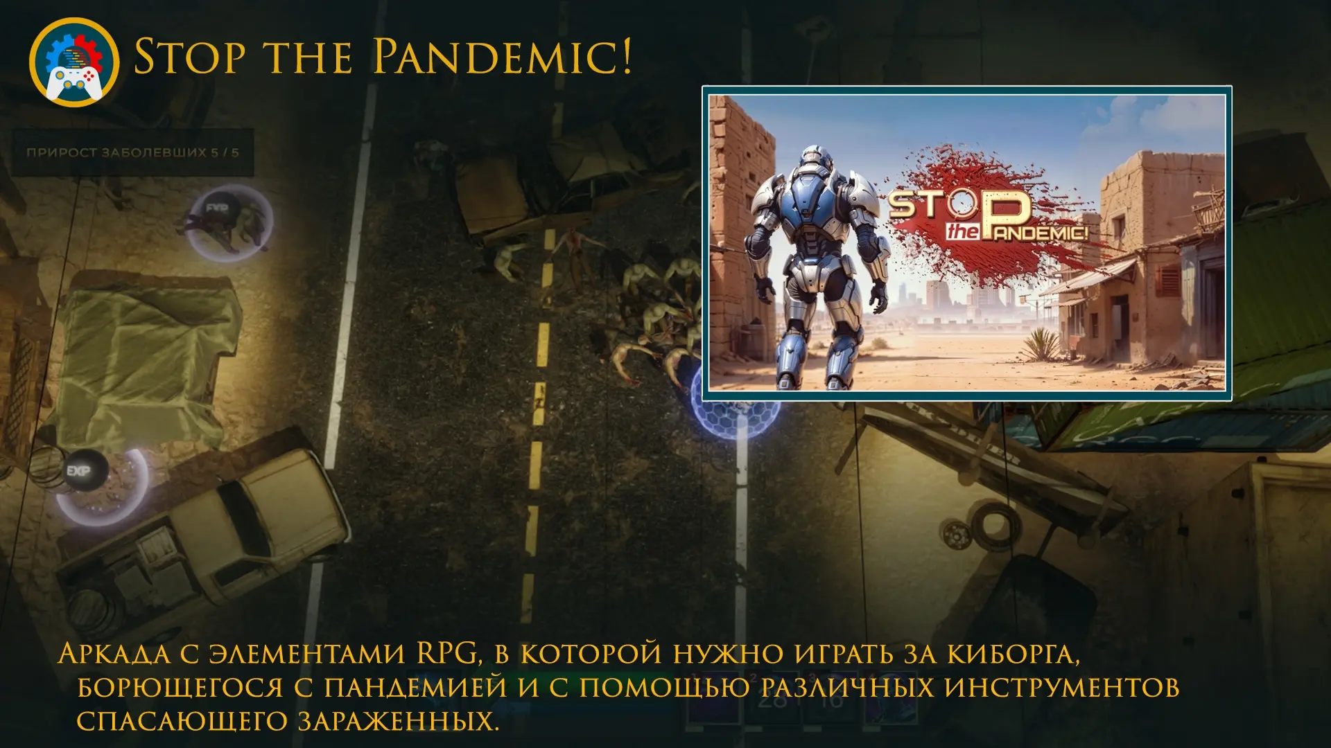 ● Stop the Pandemic! - игра в жанре аркада с элементами RPG, в которой нужно играть за киборга, борющегося с пандемией и с помощью различных инструментов спасающего зараженных.