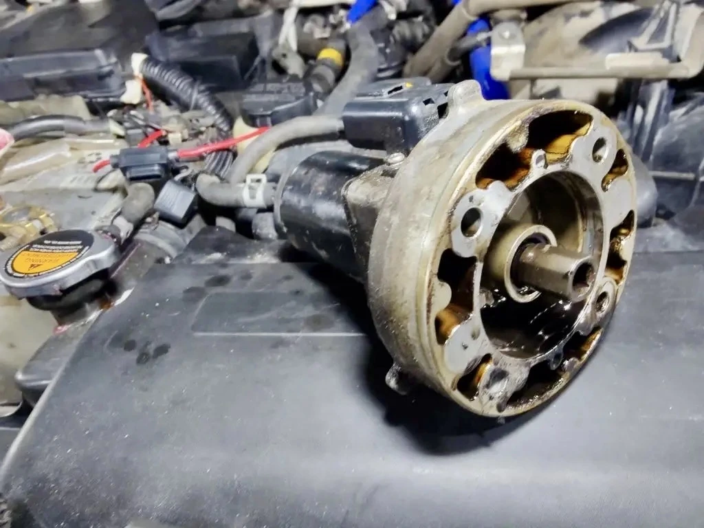 Думали демпфер провернуло, так как шкив не болтается и хорошо затянут. Но при снятии стало видно, из-за чего сместился. После замены шкива моторчик зажужжал.