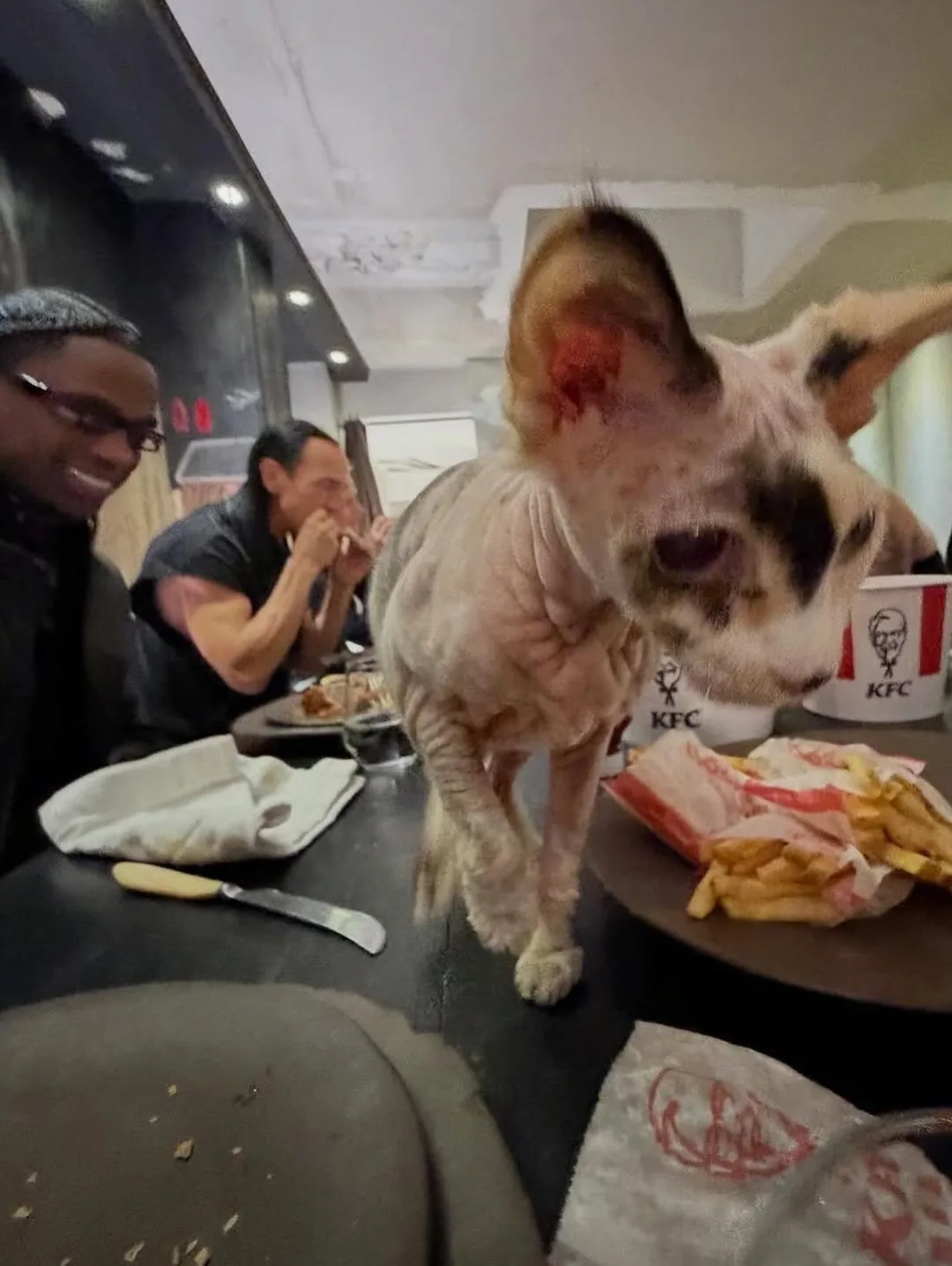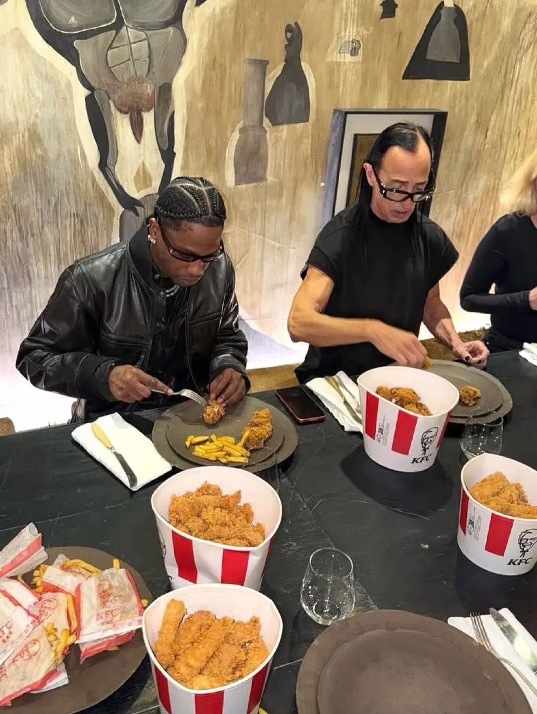 Просто Трэвис Скотт, Рик Оуэнс и какой-то сфинкс уплетают крылышки KFC в Париже во время Недели моды.