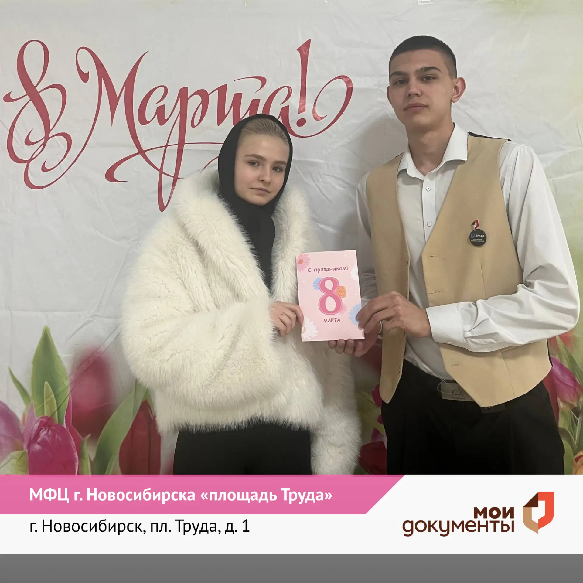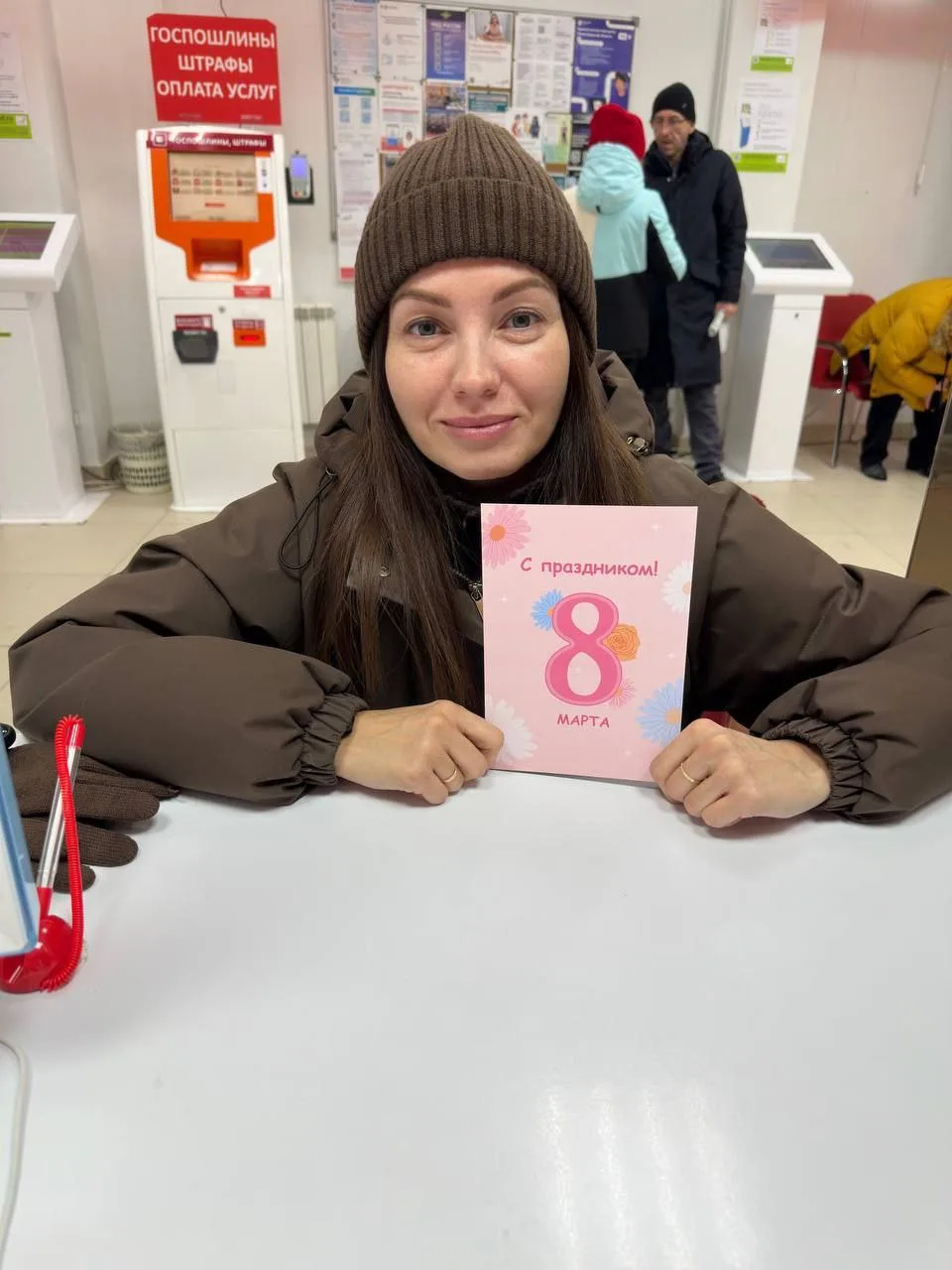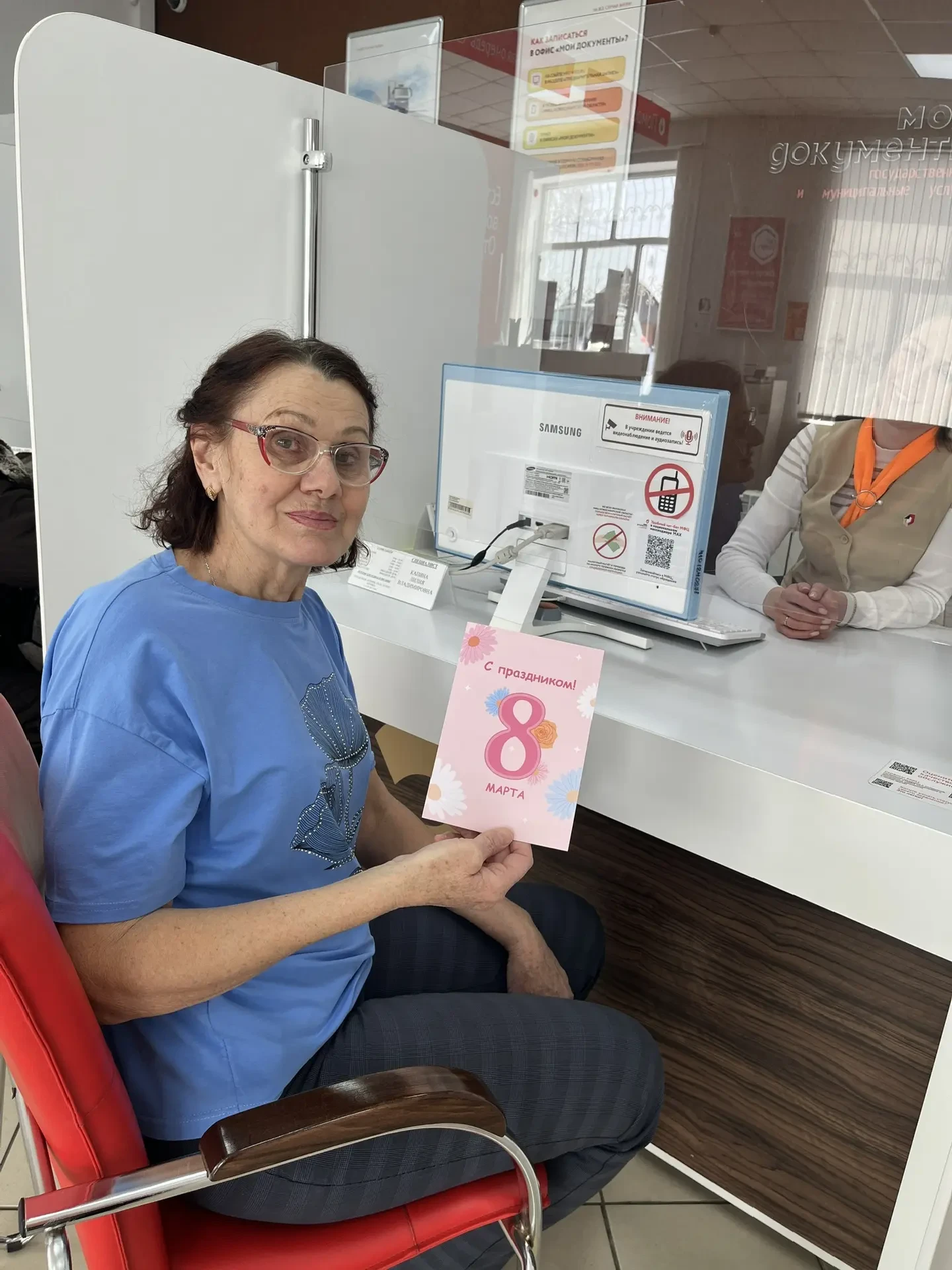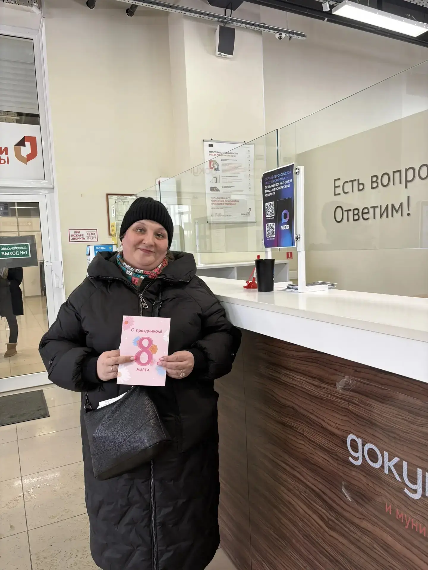 🤗 В преддверии Международного женского дня сотрудники МФЦ Новосибирской области поздравляют заявительниц с наступающим праздником. В ряде филиалов посетительницам вручают праздничные открытки с теплыми пожеланиями.