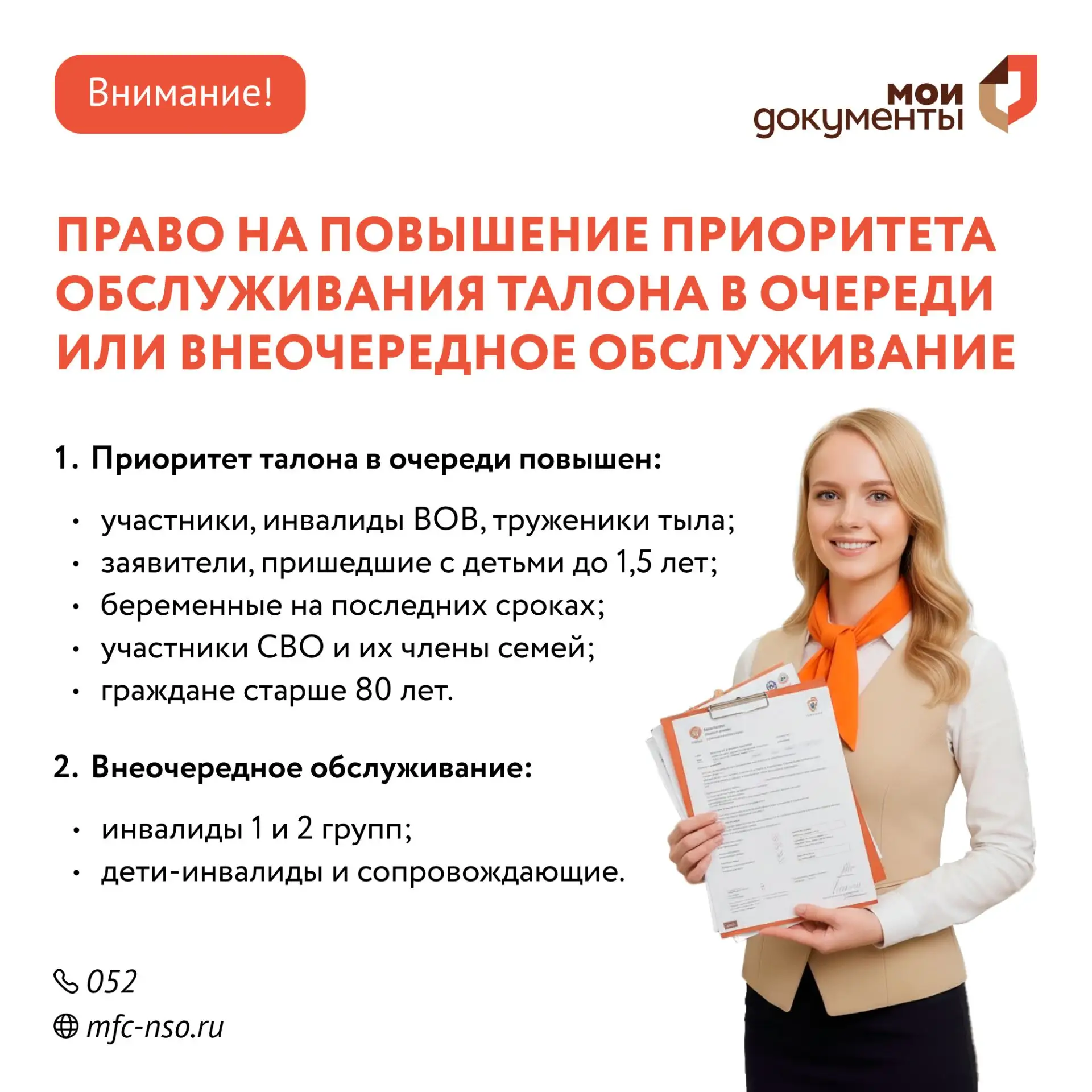 ⚡ Правом на повышение приоритета талона в очереди или внеочередное обслуживание в филиалах МФЦ Новосибирской области могут воспользоваться: