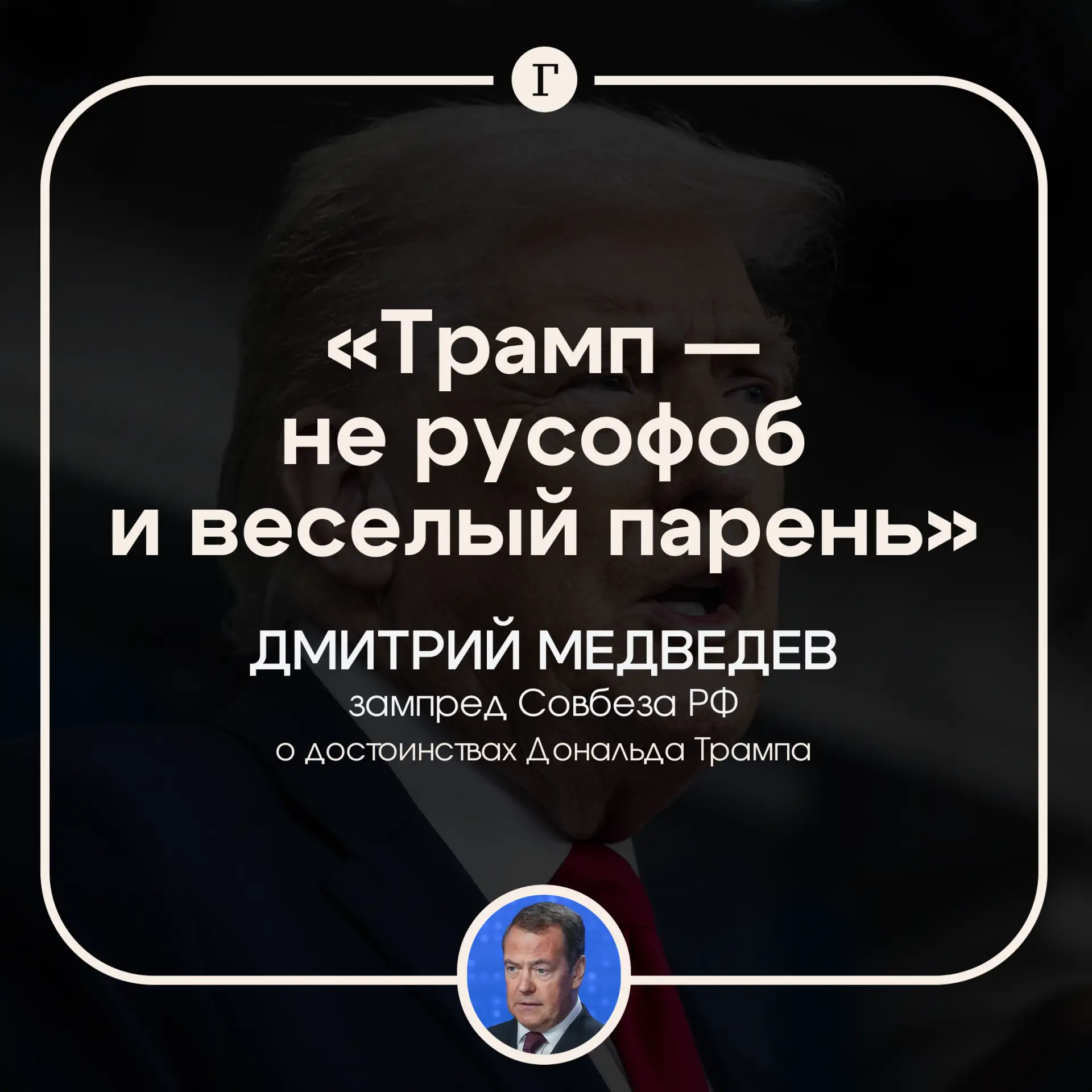 💬 «Веселые вещи пишет Дональд Трамп, я с удовольствием читаю. Я могу сказать, что как минимум у него есть два достоинства — у нынешнего президента США. Во-первых, он не русофоб, это точно. И второе, он довольно веселый парень. Так что как минимум с ним не соскучишься», — сказал зампред Совбеза РФ.