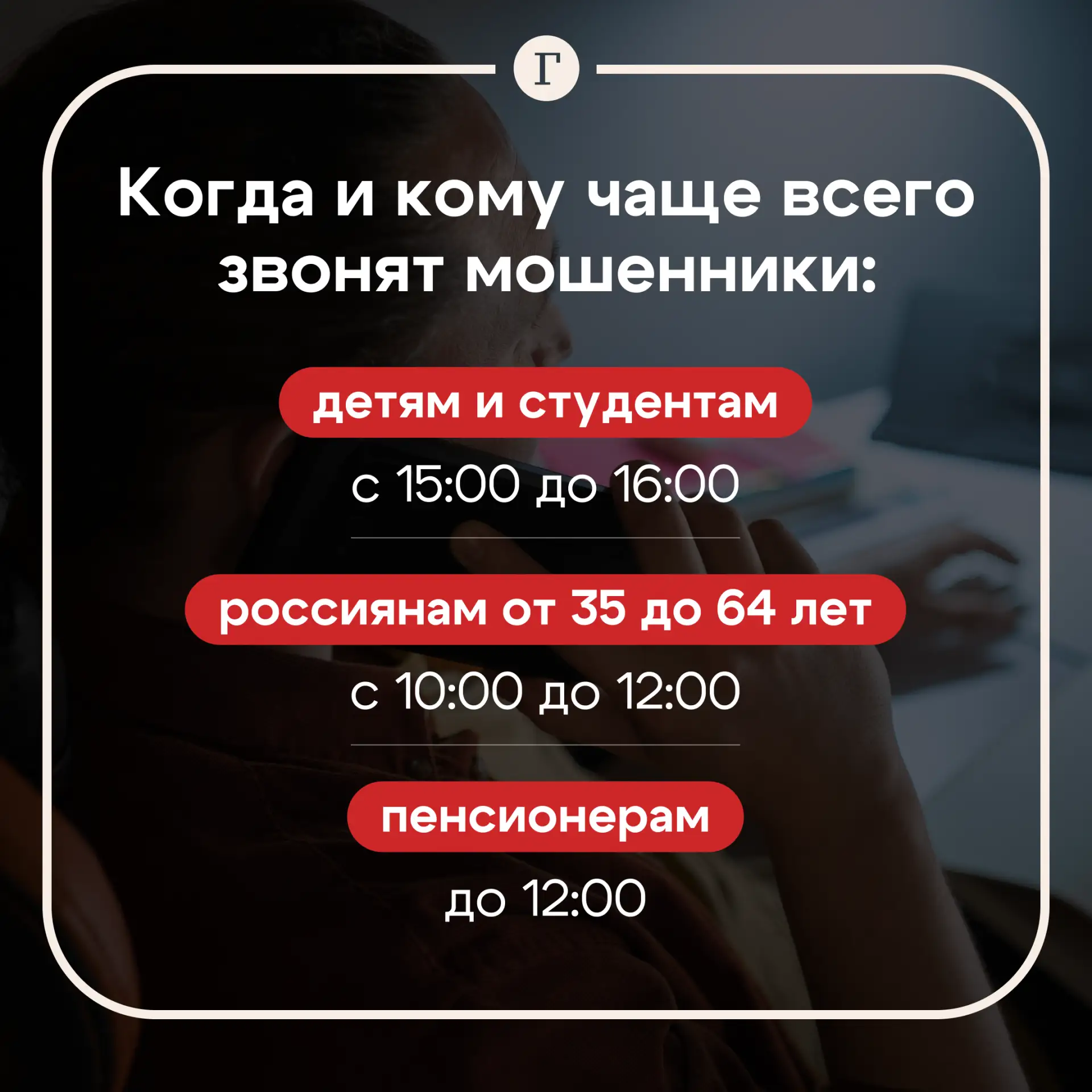 📞 Со взрослыми людьми пытаются общаться с 10:00 до 12:00, когда россияне сконцентрированы на работе и могут необдуманно ответить на нежелательный звонок.