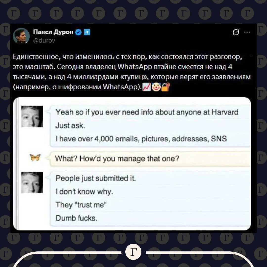 💬 «Сегодня владелец WhatsApp приватно посмеивается уже не над 4 тыс., а над 4 млрд "тупых ублюдков", которые верят его заявлениям (например, о шифровании в WhatsApp)», — написал Дуров.