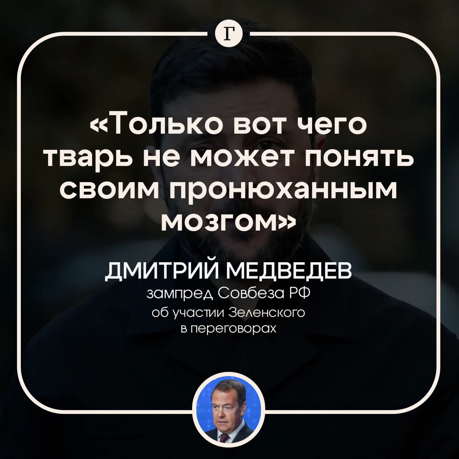 Украинский лидер никогда не будет для России законной стороной для переговоров, тем более для подписания капитуляции Украины, заявил зампредседателя Совбеза РФ.