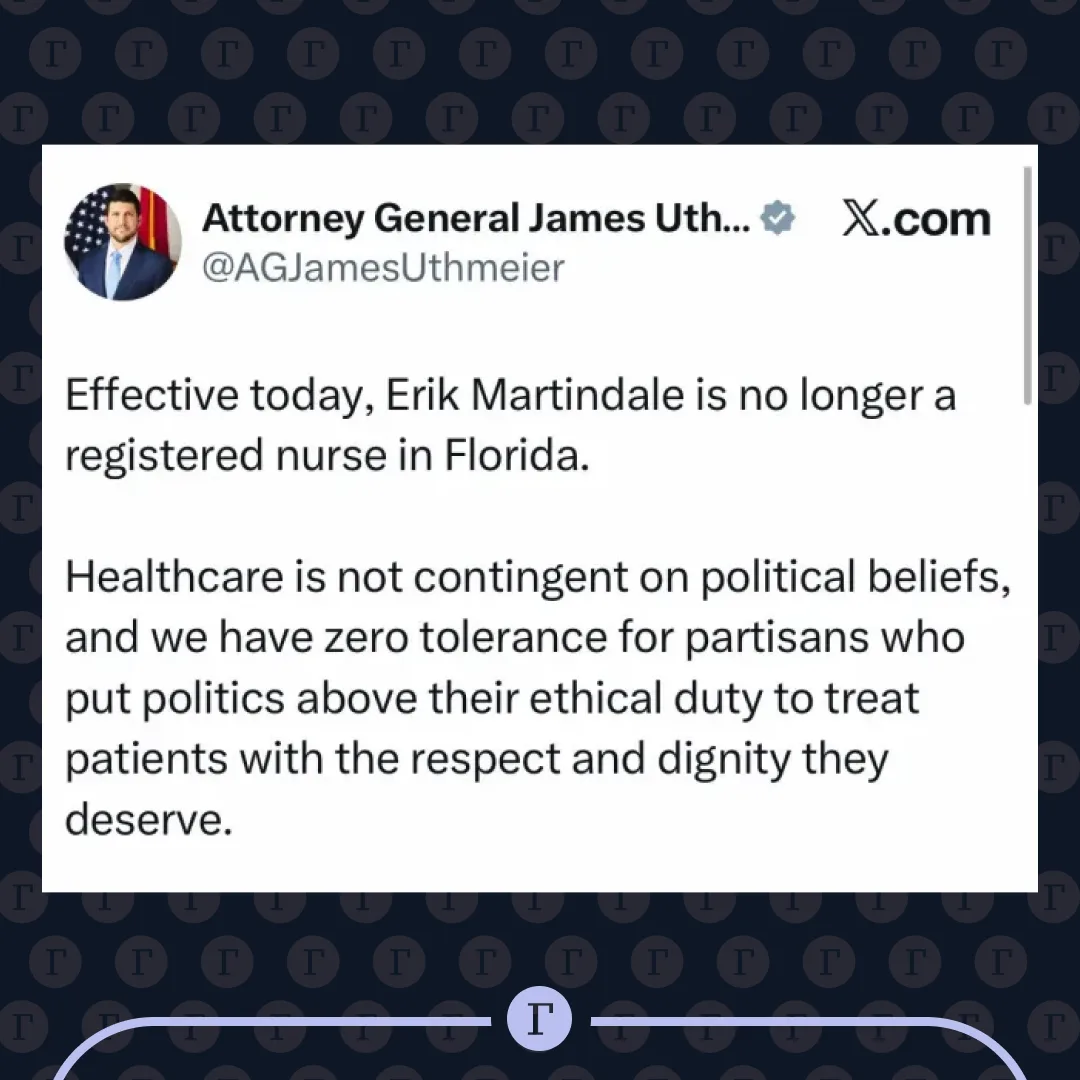 Генеральный прокурор штата Джеймс Утмайер отреагировал на пост заявлением, что Мартиндейл «больше не является зарегистрированным медбратом во Флориде».