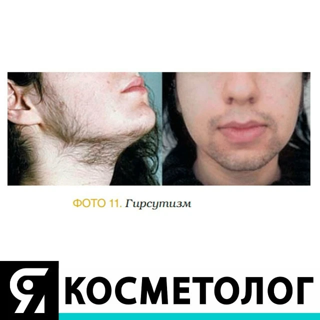 🔺 гирсутизма – избыточного роста стержневых волос по мужскому типу, включая область подбородка, лица, шеи, спины, груди и нижней части живота. Однако уровень андрогенов не коррелирует с интенсивностью роста волос;