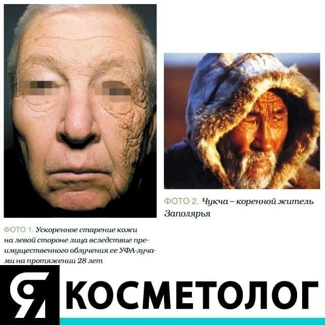 👁 Наглядным примером ускоренного старения кожи является эксперимент, поставленной самой жизнью и описанный в литературе. Водитель, которому исполнилось 69 лет, на протяжении 28 лет водил грузовик, подвергаясь воздействию УФА-лучей (320–400 нм) преимущественно с одной стороны. На этой стороне лица отчетливо проявились признаки солнечной геродермии (синдром преждевременного старения кожи под действием УФ-лучей): солнечный эластоз, солнечный кератоз, старческое лентиго, старческая пурпура и т.д.