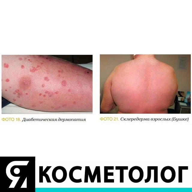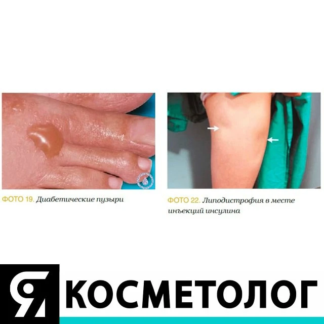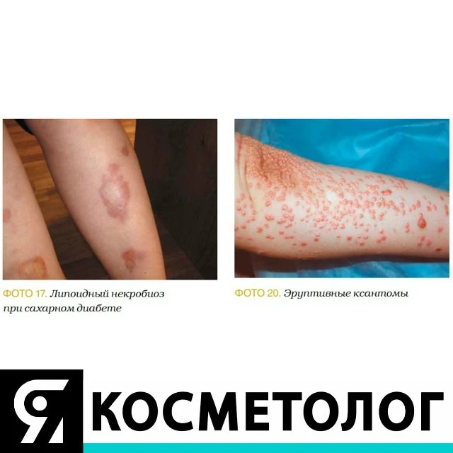 1️⃣ Специфичные: липоидный некробиоз (желтоватые бляшки на голенях), диабетические пузыри (внезапные большие пузыри на конечностях), склередема (стойкий отек лица, шеи и туловища), эруптивные ксантомы (красновато-желтые папулы при гипертриглицеридемии), липоатрофия (отсутствие подкожной клетчатки в местах инъекций инсулина).